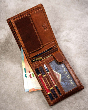Ši elegantiška ir funkcionali piniginė vyrams yra pagaminta iš aukštos kokybės natūralios odos, kuri užtikrina ilgaamžiškumą ir stilingą išvaizdą. Šviesiai ruda spalva suteikia piniginei klasikinį ir universalų dizainą, tinkantį įvairioms progoms.