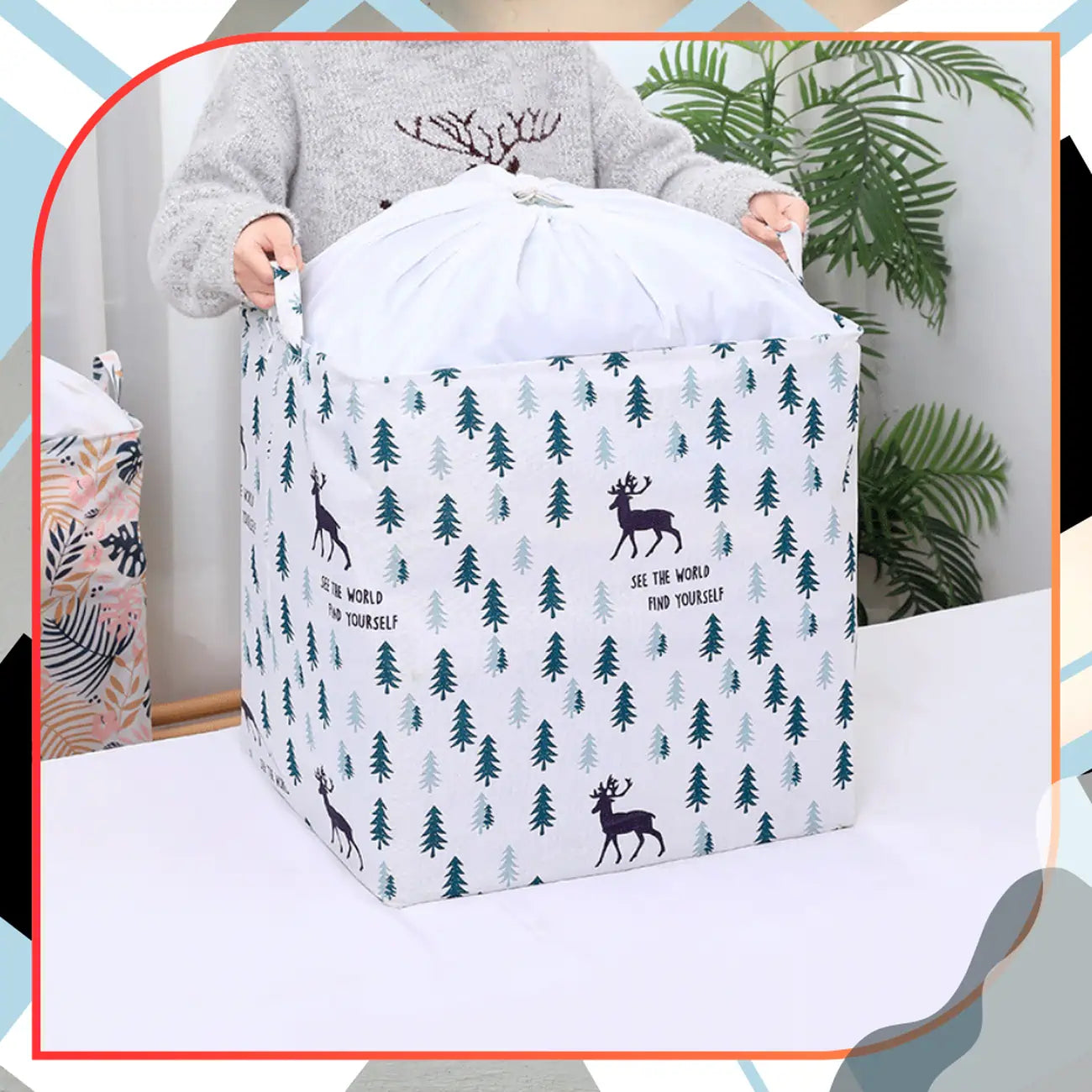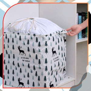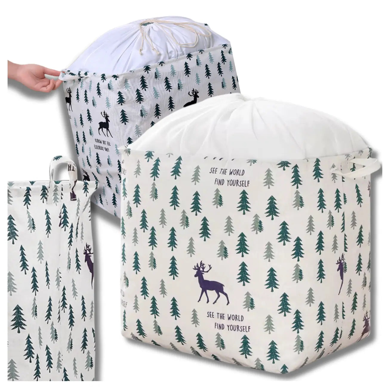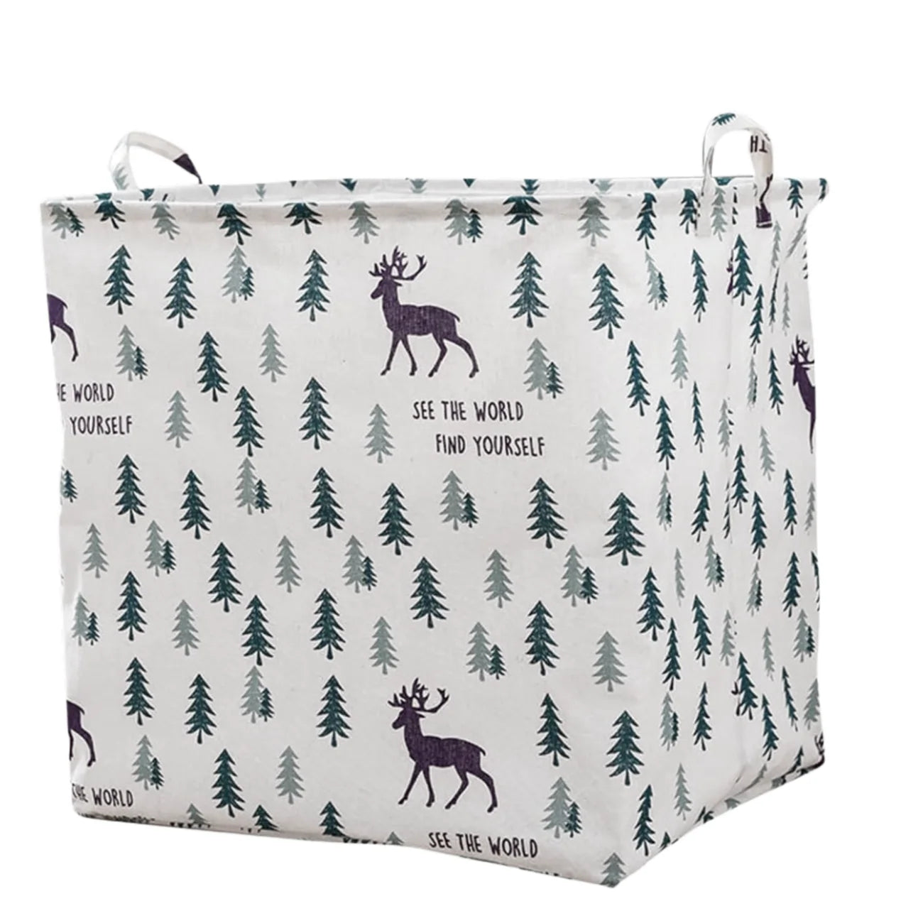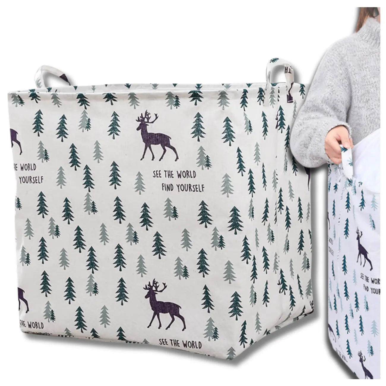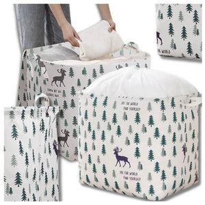 Spalva ir unikalios savybės: Krepšys pasižymi miško motyvu su eglutėmis ir elniais, kuris puikiai dera prie bet kokio interjero. Sustiprinti kraštai ir tvirti siūliai užtikrina ilgaamžiškumą.