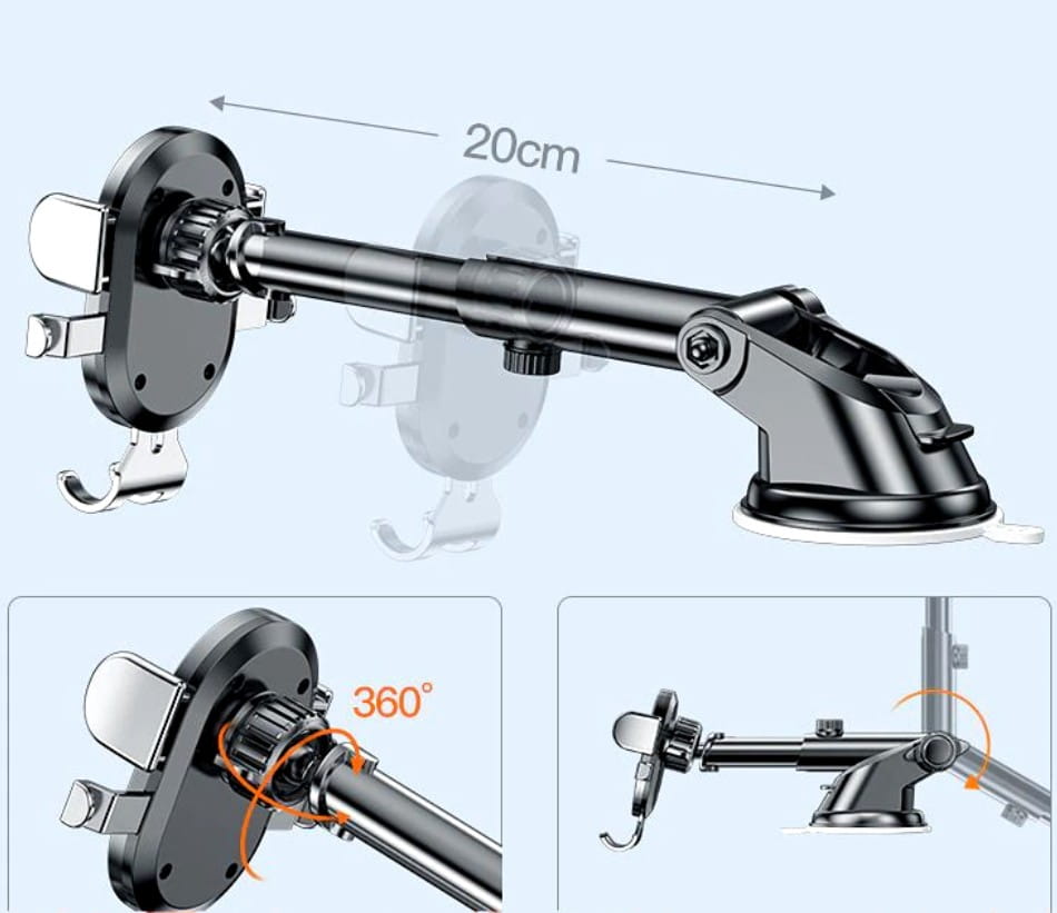 - 360° pasukimo funkcija: Kelių taškų reguliavimas leidžia pasukti ir stabilizuoti telefoną įvairiose plokštumose.