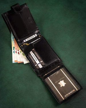 Ši elegantiška vyriška piniginė iš Rovicky yra pagaminta iš aukštos kokybės natūralios odos, užtikrinančios ilgaamžiškumą ir stilingą išvaizdą.