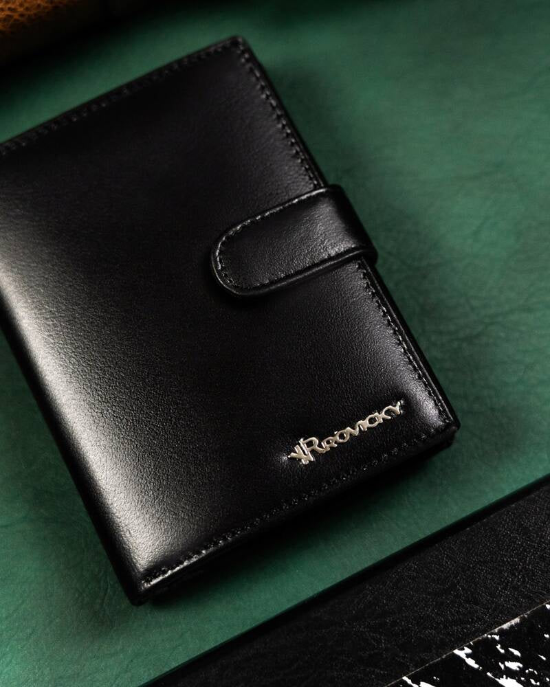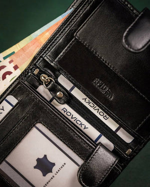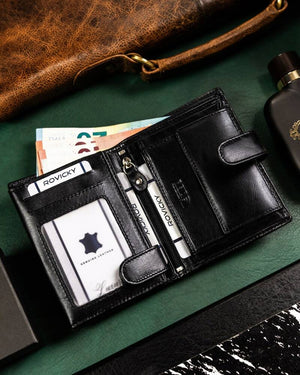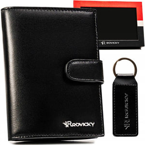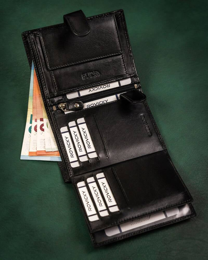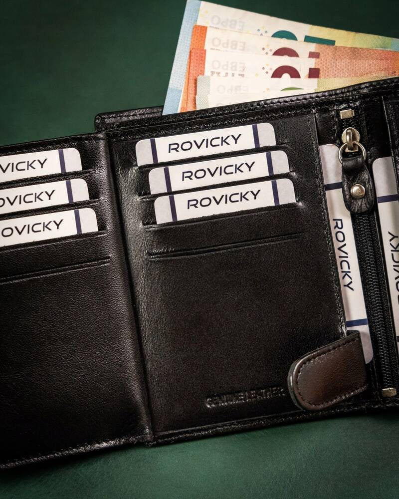 Ši elegantiška vyriška piniginė iš Rovicky yra pagaminta iš aukštos kokybės natūralios odos, užtikrinančios ilgaamžiškumą ir stilingą išvaizdą. Juoda spalva suteikia klasikinį ir universalų įvaizdį, tinkantį bet kokiai progai.