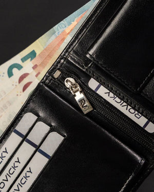 Ši elegantiška vyriška piniginė iš Rovicky yra pagaminta iš aukštos kokybės natūralios odos, kuri užtikrina ilgaamžiškumą ir stilingą išvaizdą. Juoda spalva suteikia klasikinį ir universalų įvaizdį, tinkantį bet kokiai progai.
