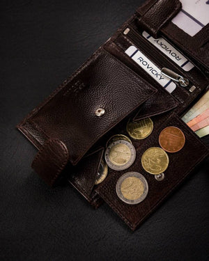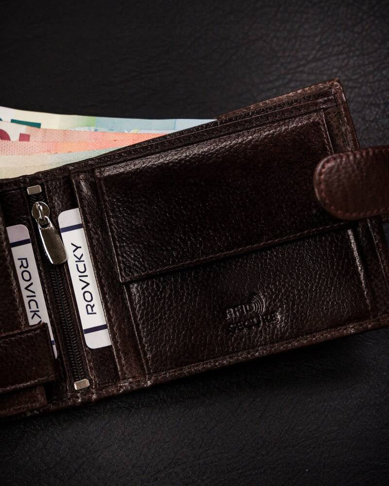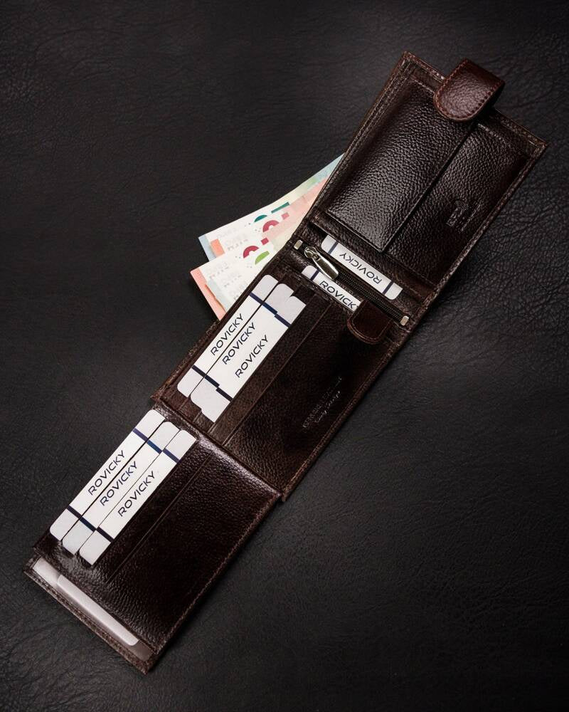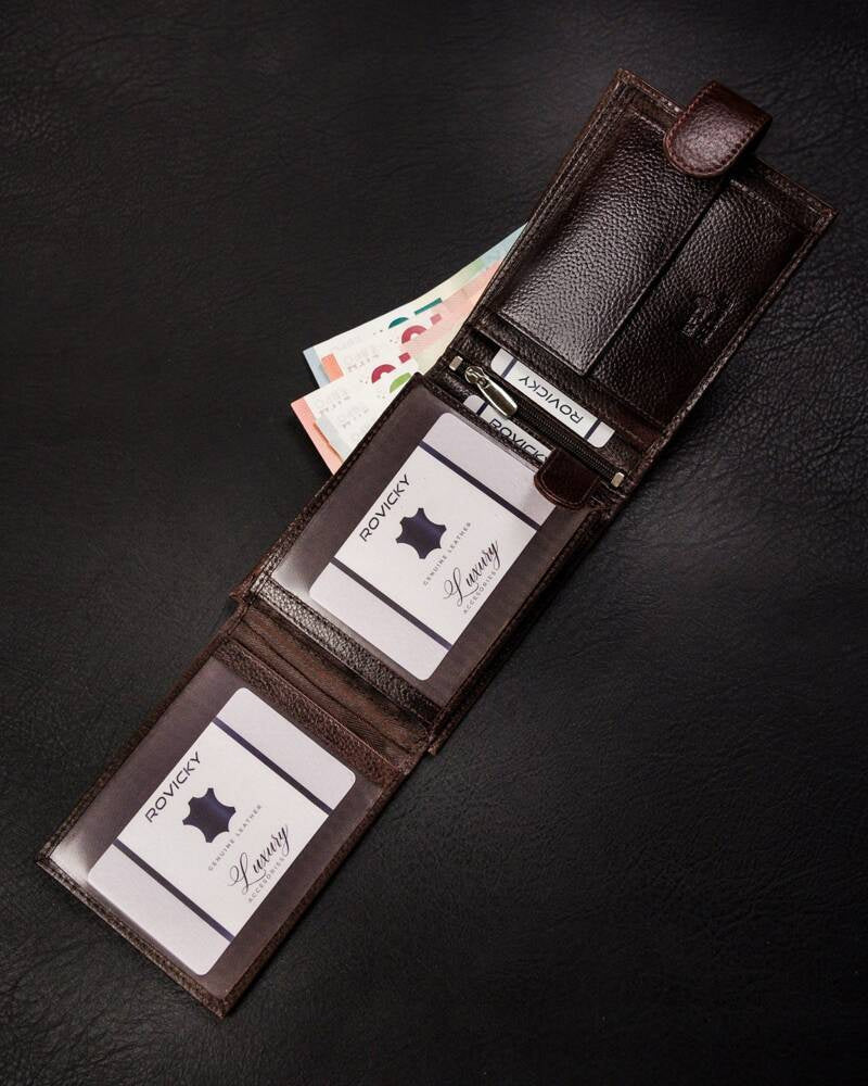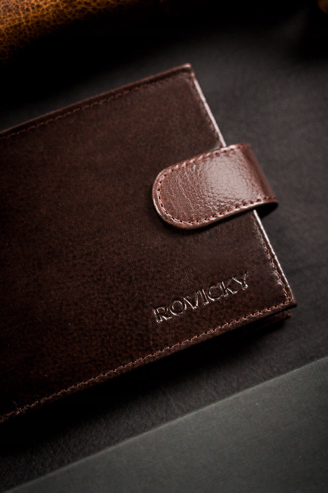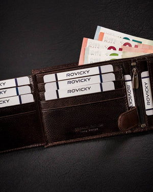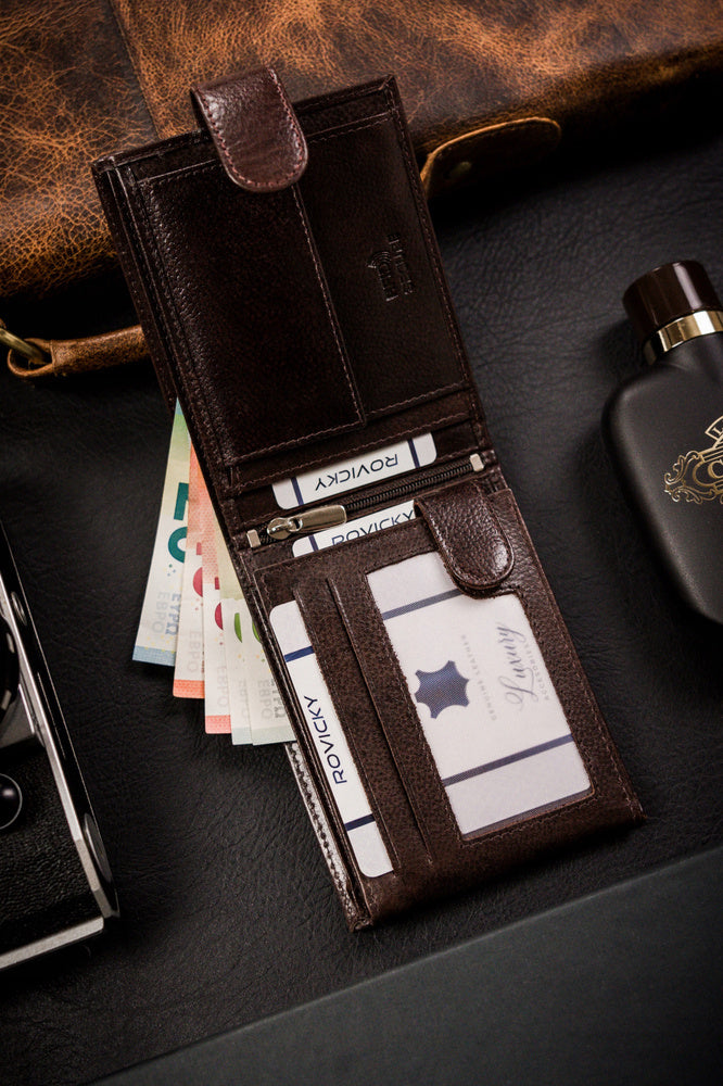 Ši vyriška odinė piniginė Rovicky RV233 yra puikus pasirinkimas tiems, kurie vertina kokybę ir funkcionalumą. Pagaminta iš natūralios odos, ji pasižymi elegantiška ruda spalva ir dideliu dydžiu, kuris užtikrina pakankamai vietos jūsų kortelėms ir gryniesiems. Piniginė turi 6-10 kortelių skyrius ir yra aprūpinta RFID apsauga, kuri padeda apsaugoti jūsų duomenis nuo neteisėto nuskaitymo. Jos kompaktiški išmatavimai - 9,5 cm x 12,5 cm x 2 cm - leidžia patogiai nešiotis kasdien.