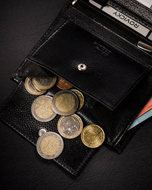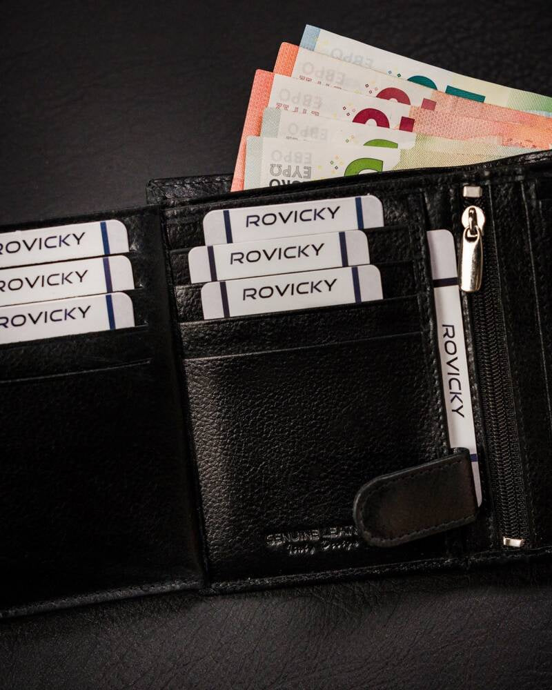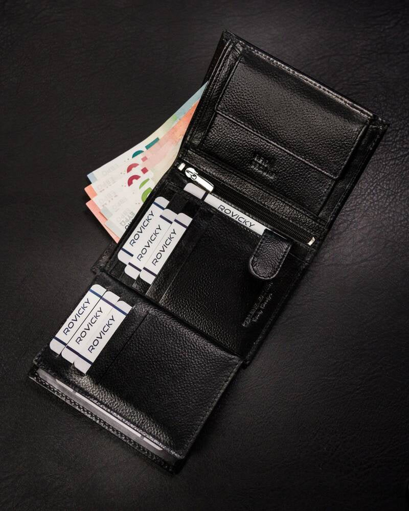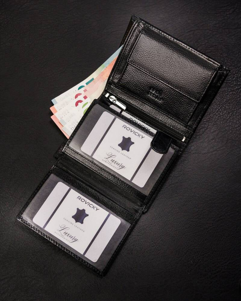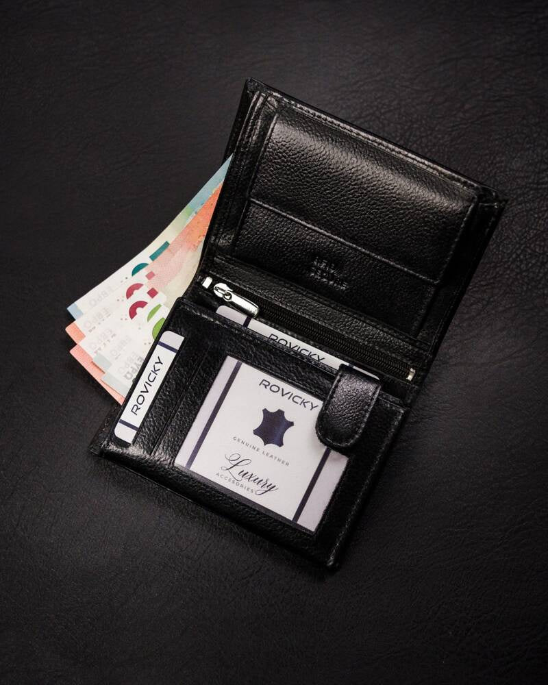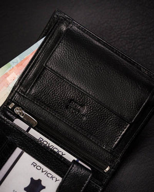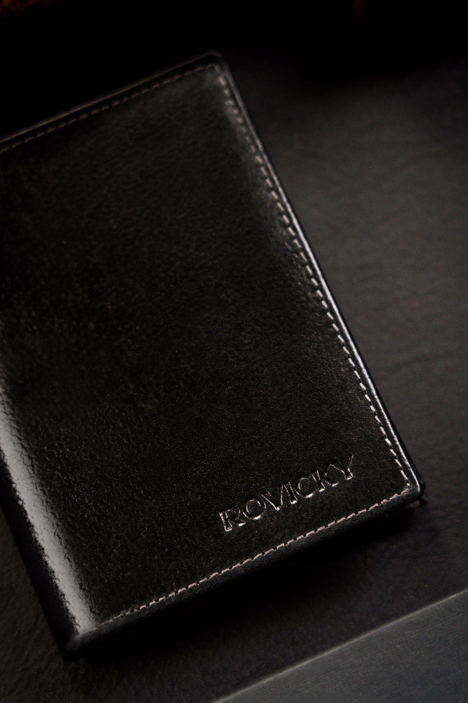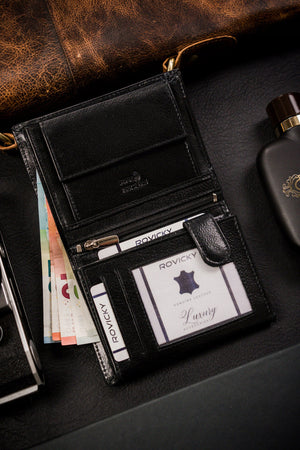 Ši elegantiška vyriška piniginė iš Rovicky yra pagaminta iš aukštos kokybės natūralios odos, kuri užtikrina ilgaamžiškumą ir stilingą išvaizdą. Juodos spalvos dizainas suteikia klasikinį ir universalų įvaizdį, tinkantį bet kokiai progai.