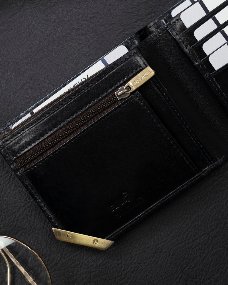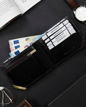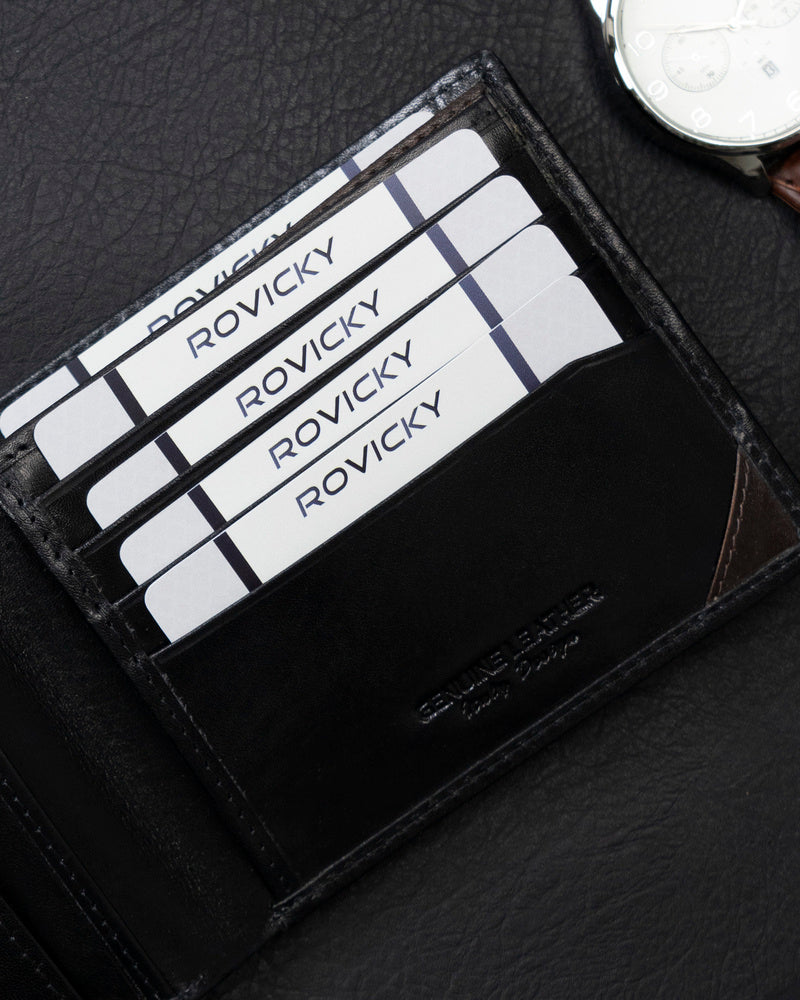 Ši vyriška odinė piniginė Rovicky RV67 yra puikus pasirinkimas tiems, kurie vertina kokybę ir funkcionalumą. Pagaminta iš natūralios odos, ji ne tik atrodo elegantiškai, bet ir yra patvari. Juoda spalva suteikia klasikinį ir universalų stilių, tinkantį bet kokiai progai. Vidutinio dydžio piniginė yra patogi nešioti, o daugiau nei 10 kortelių skyrių užtikrina, kad visos jūsų kortelės bus tvarkingai sudėtos. Be to, RFID apsauga padės apsaugoti jūsų asmeninius duomenis nuo neteisėto nuskaitymo. Išmatavimai 9,5 cm x 11,5 cm x 2 cm leidžia piniginę lengvai tilpti į kišenę ar rankinę.