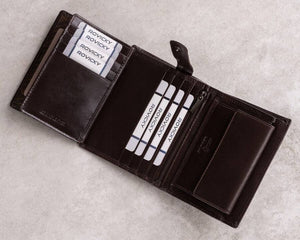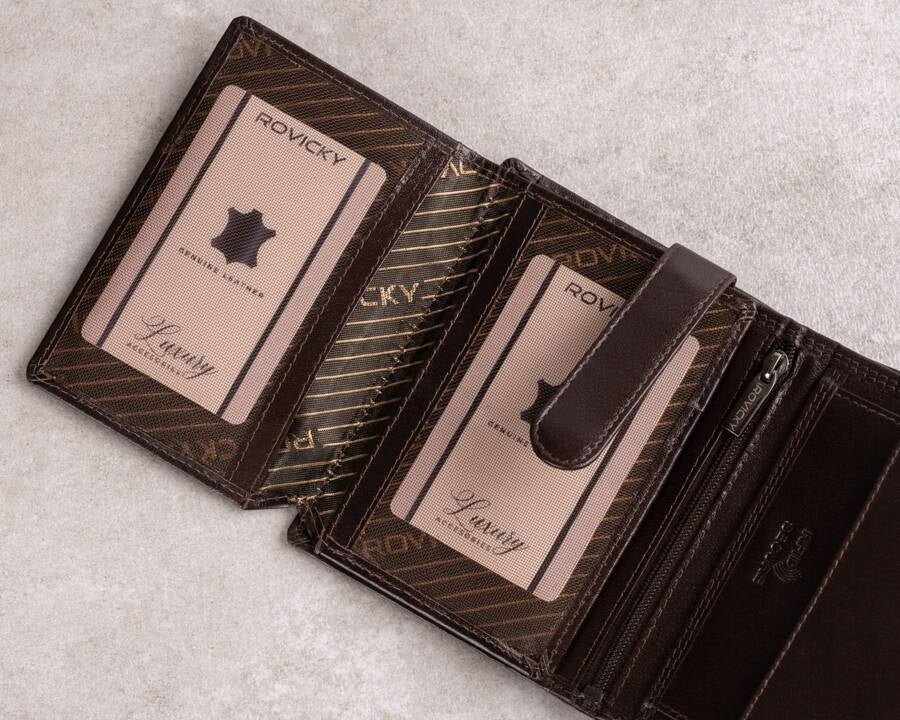 Ši vyriška piniginė iš Rovicky kolekcijos yra pagaminta iš aukštos kokybės natūralios odos, kuri užtikrina ilgaamžiškumą ir eleganciją. Rudos spalvos dizainas suteikia klasikinį ir stilingą įvaizdį.