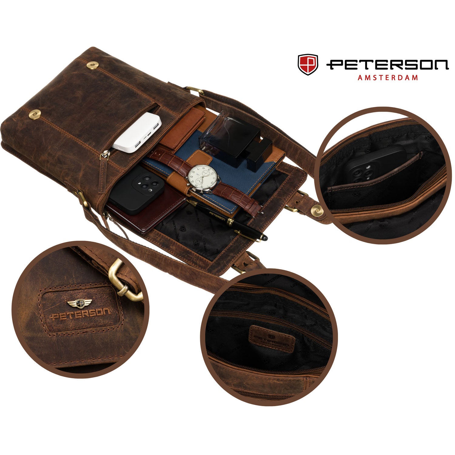 Peterson vyriška rankinė iš natūralios odos, rudos spalvos, su reguliuojamu diržu.