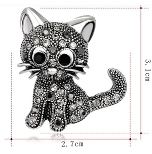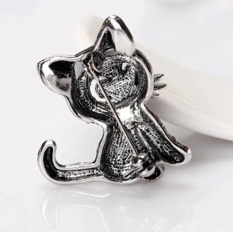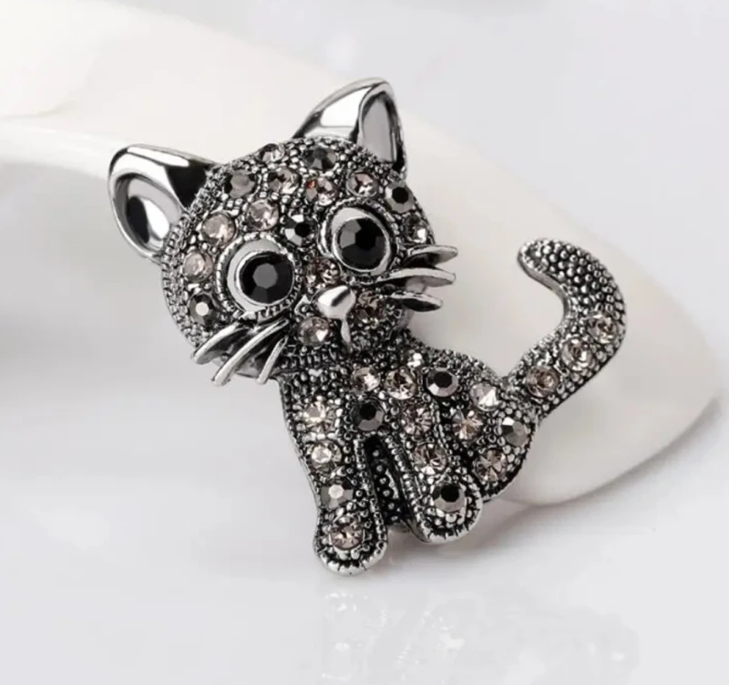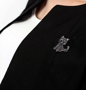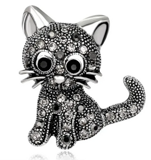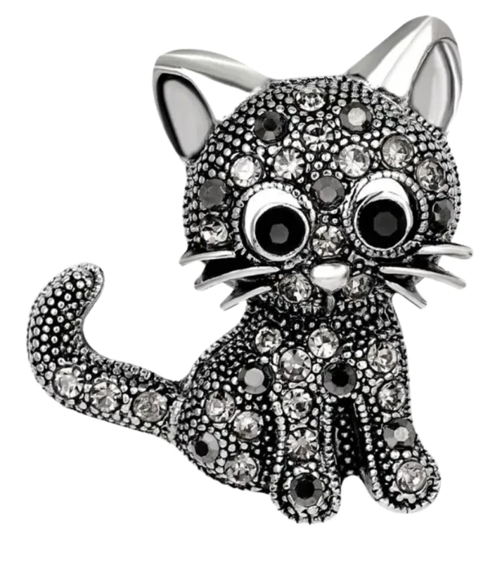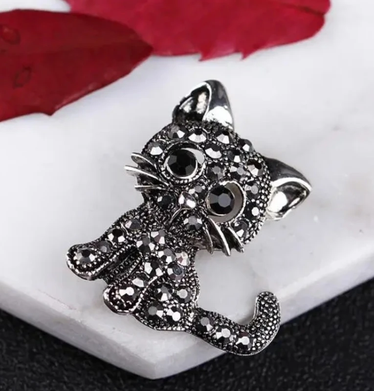 Elegantiška juoda katės sagė, dekoruota cirkoniais
