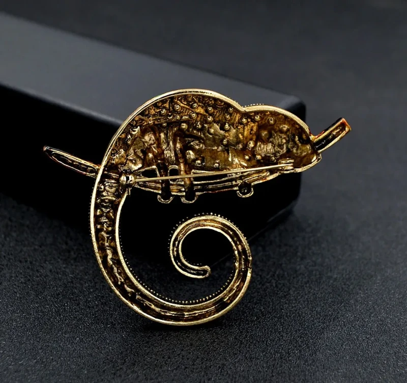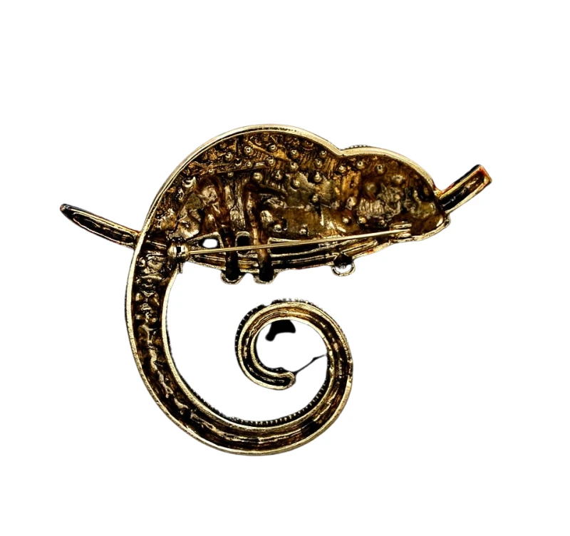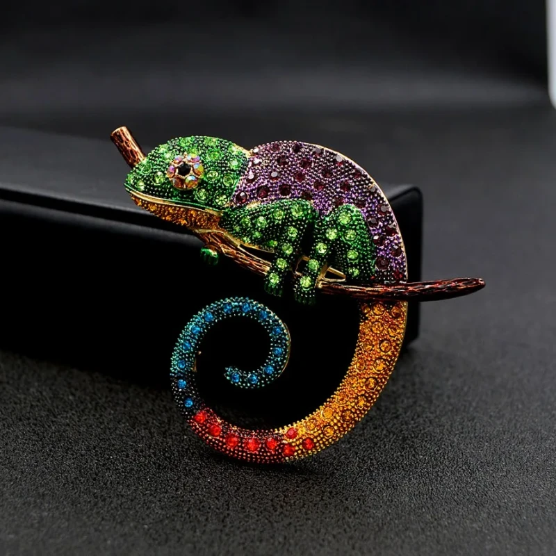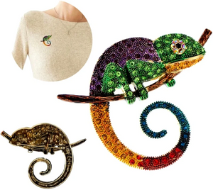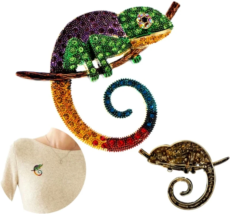 Ši elegantiška chameleono sagė, dekoruota cirkoniais, yra puikus aksesuaras, kuris suteiks jūsų aprangai išskirtinumo. Ji puikiai tinka dėvėti ant suknelės, švarko, kepurės, krepšio ar palto.