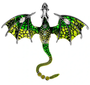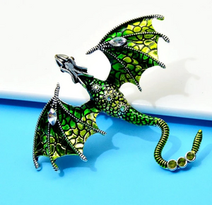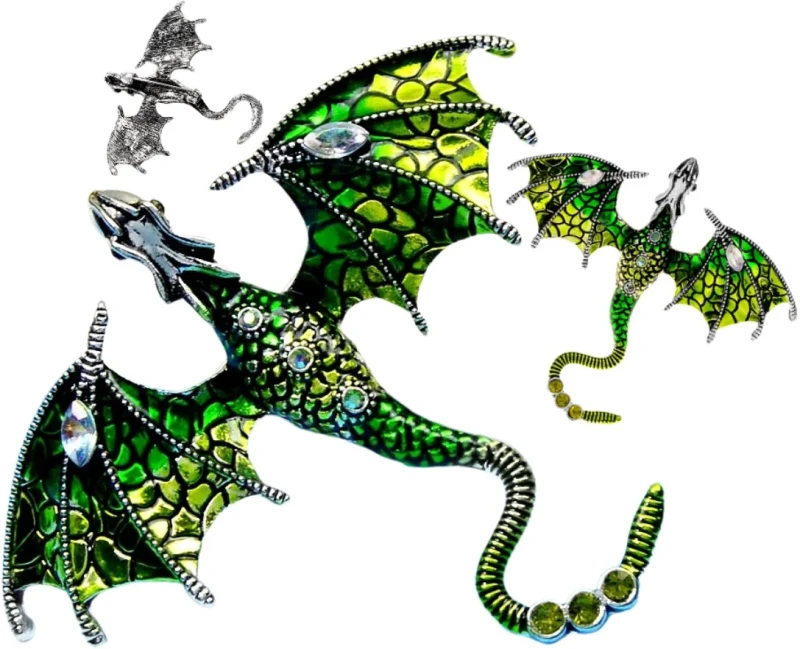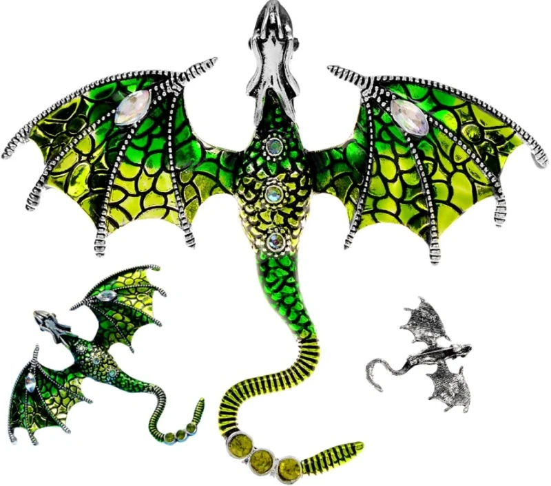 Ši elegantiška žalios spalvos drakono sagė, dekoruota cirkoniais, yra puikus aksesuaras, kuris suteiks išskirtinumo jūsų aprangai. Ji puikiai tinka dėvėti ant suknelės, švarko, kepurės, krepšio ar palto.