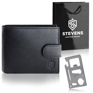 Dovanų komplektas vyrui – STEVENS odinė piniginė su RFID apsauga, išgyvenimo kortelė ir dovanų maišelis 325A