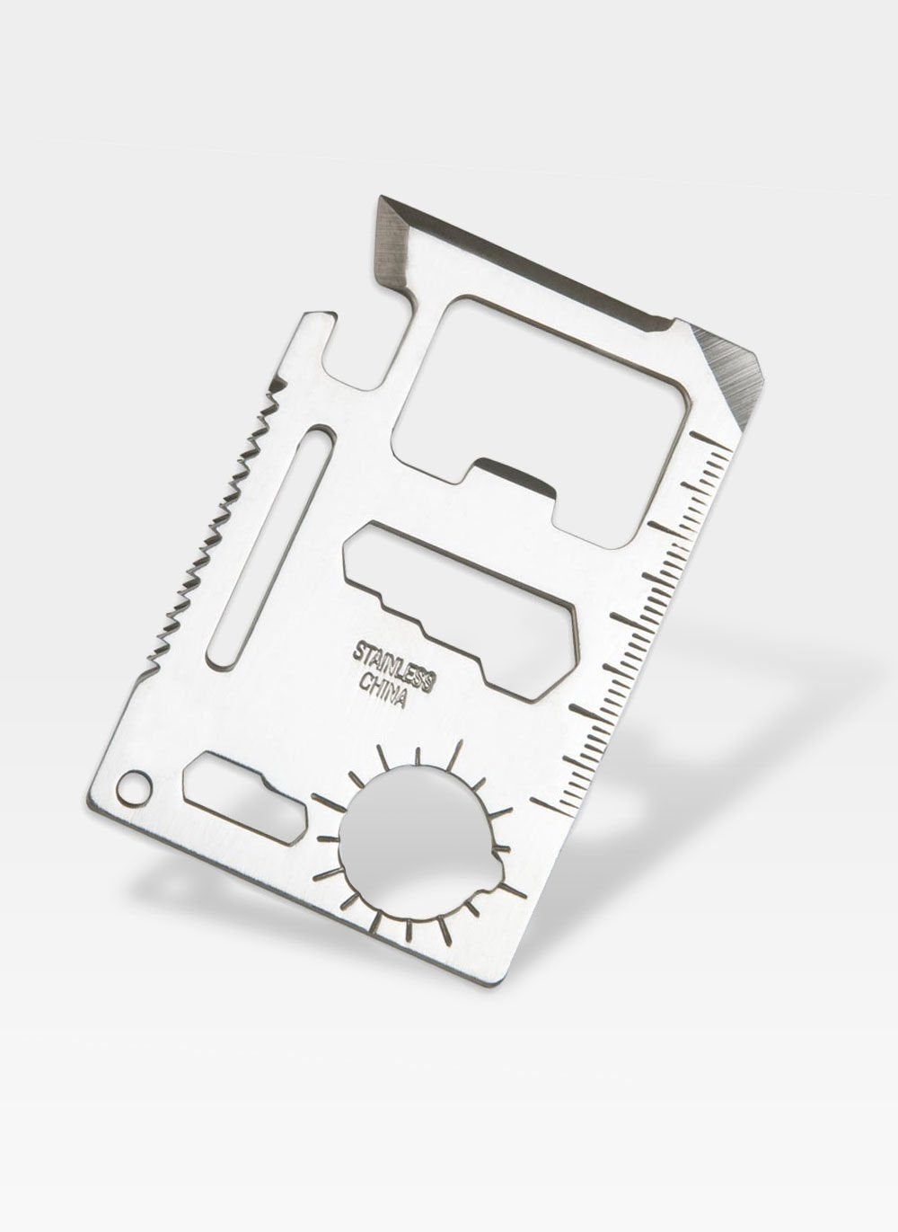 - Kompaktiška išgyvenimo kortelė iš plieno su įvairiais įrankiais