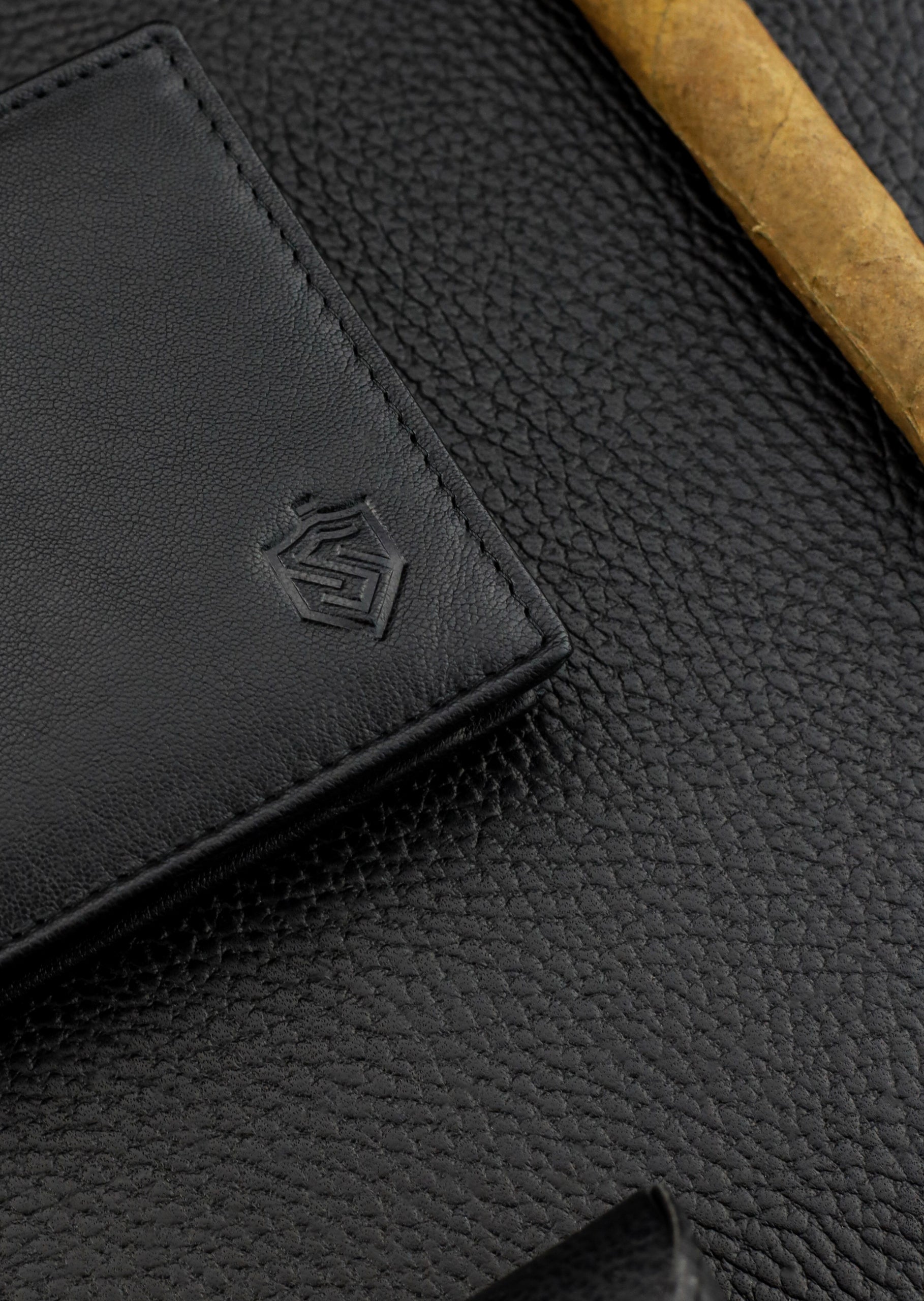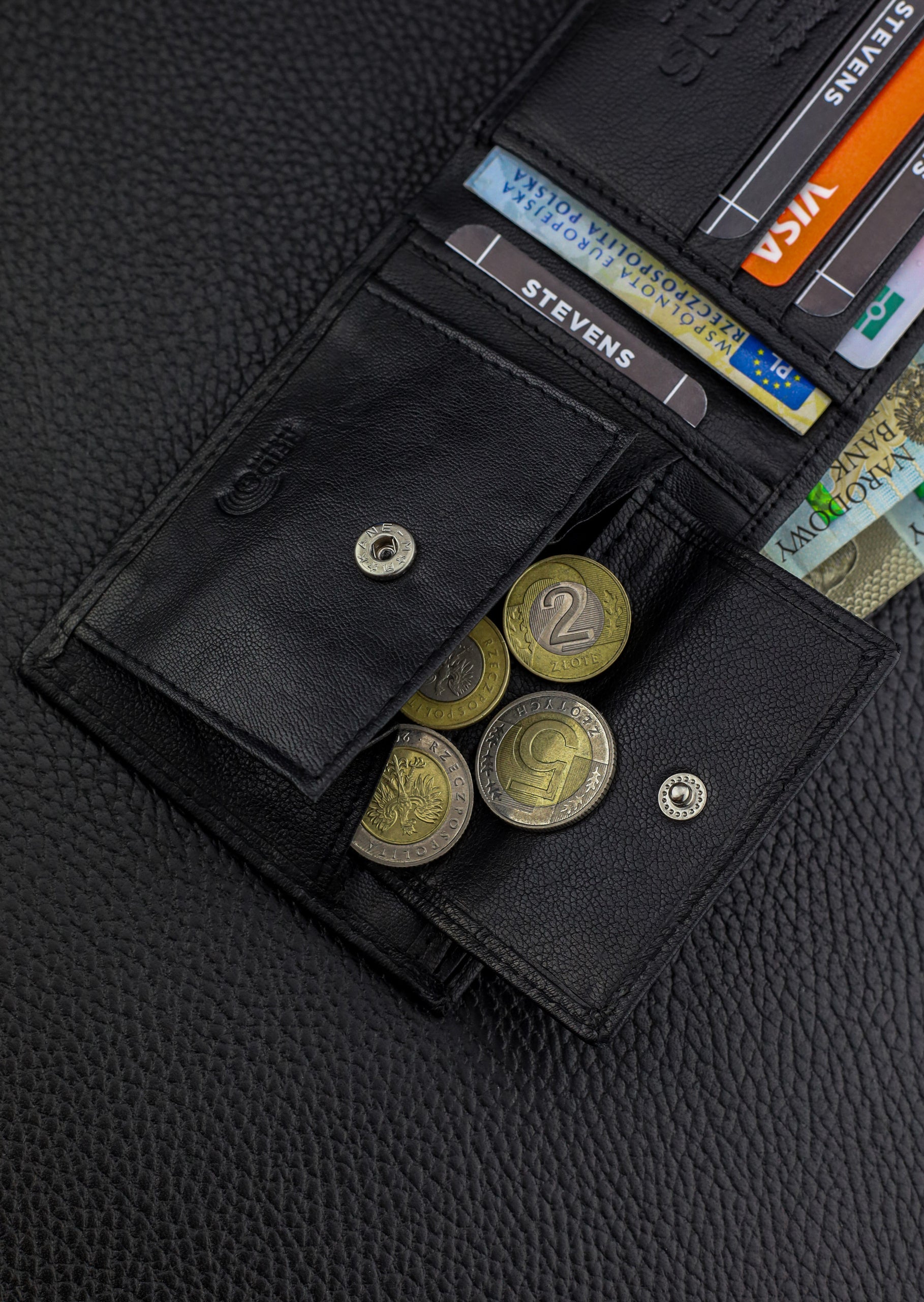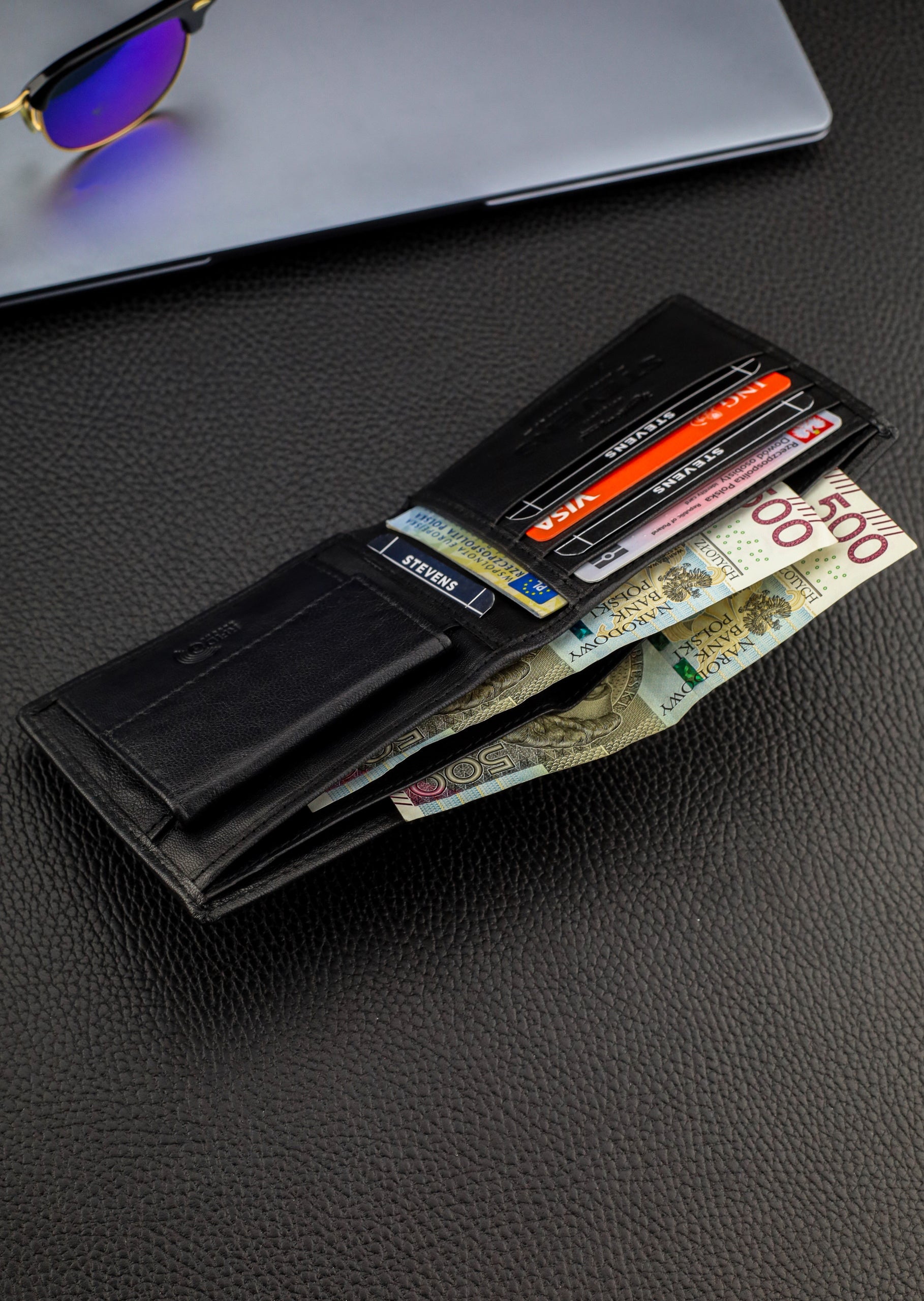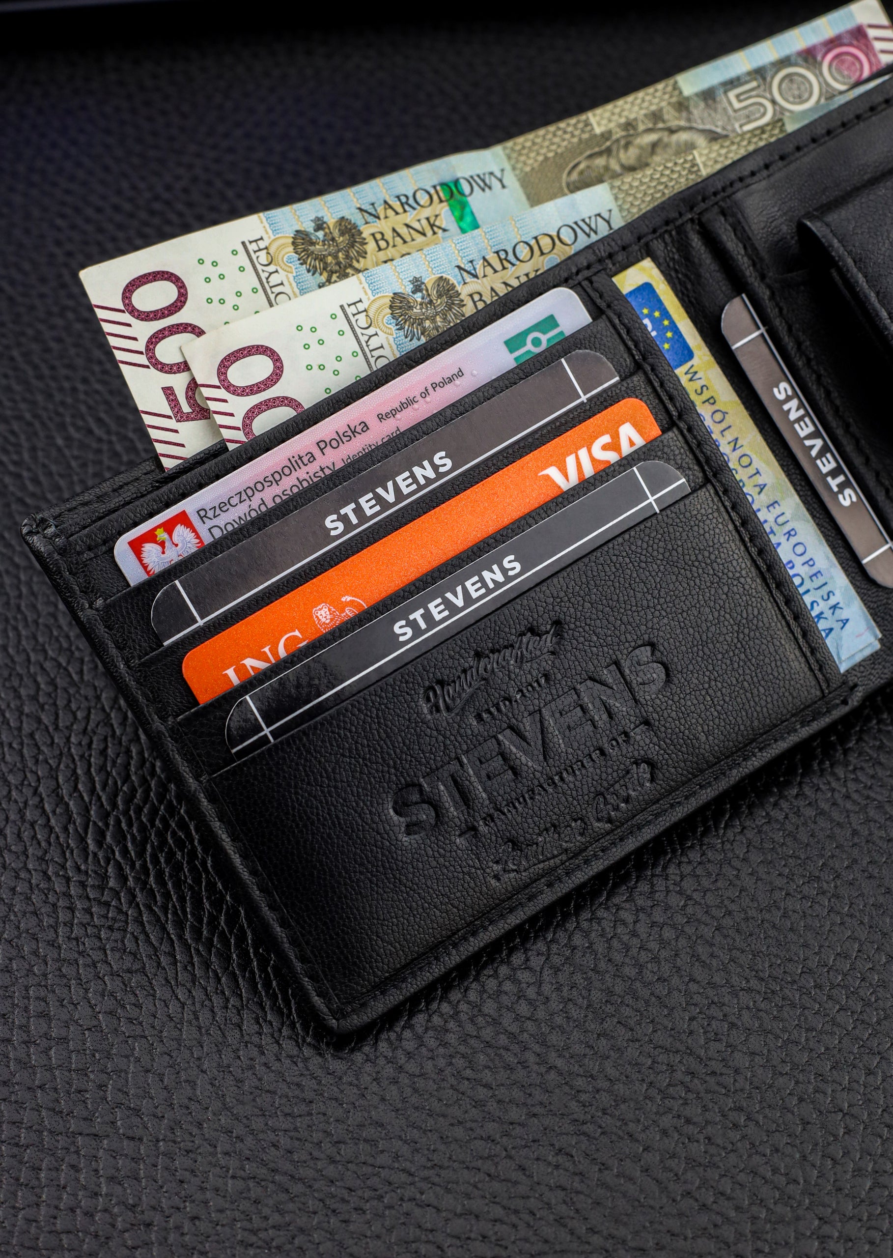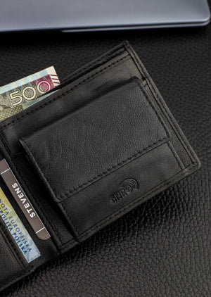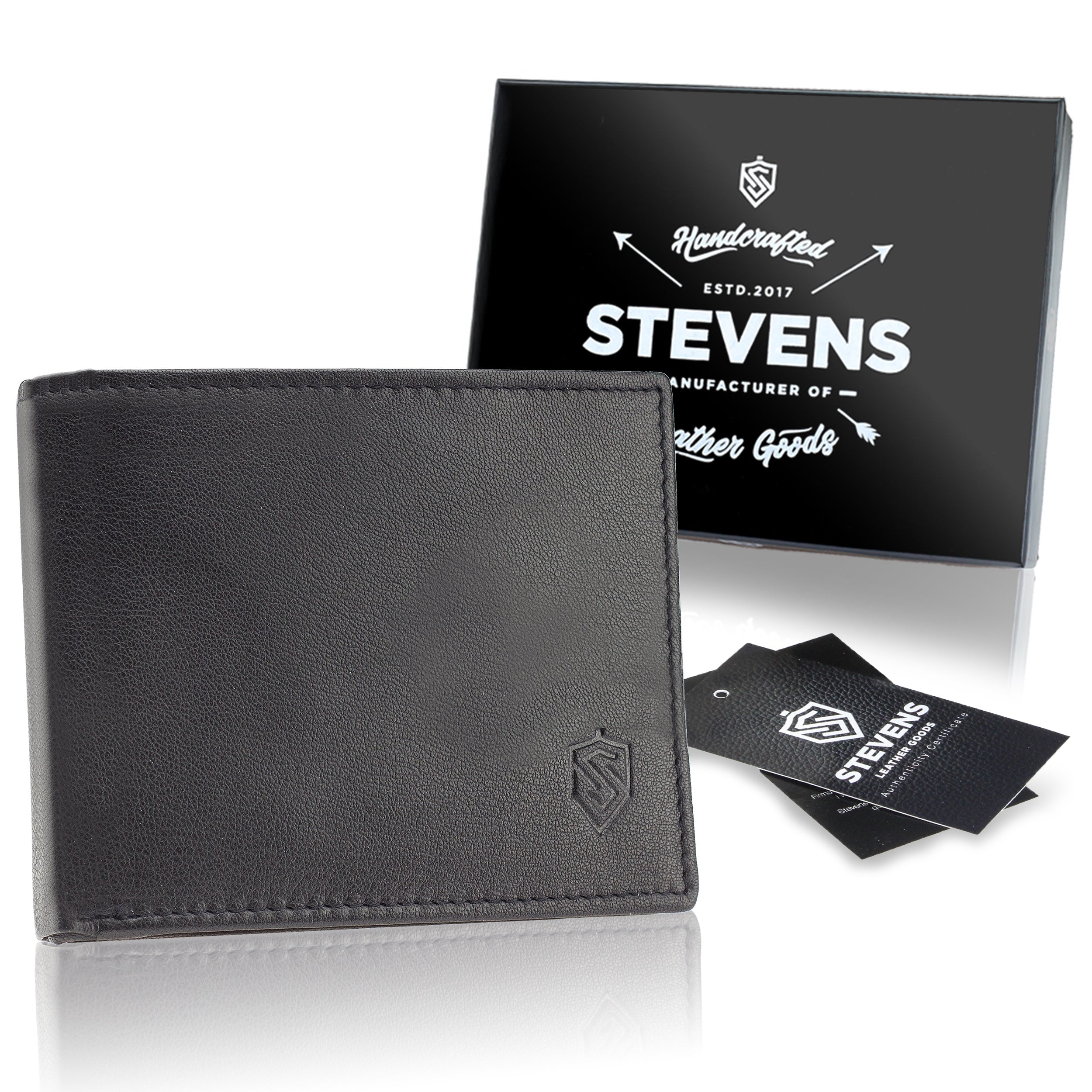 Dovanų rinkinys: Odinė vyriška piniginė STEVENS® su RFID apsauga, išgyvenimo kortelė ir dovanų maišelis STEVENS®