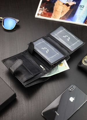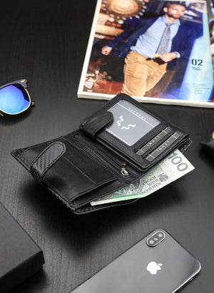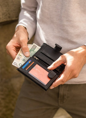 Kairioji piniginės dalis, kurioje laikomos kortelės ir dokumentai, yra užsegama, todėl galite būti tikri, kad niekas neiškris.