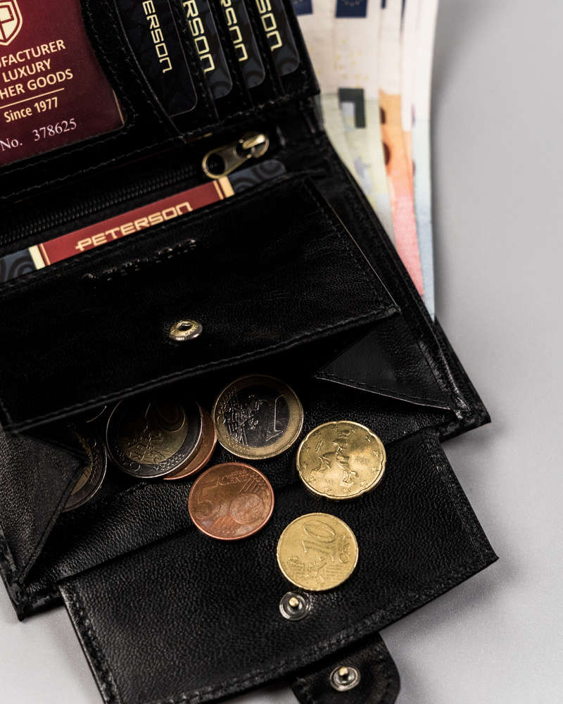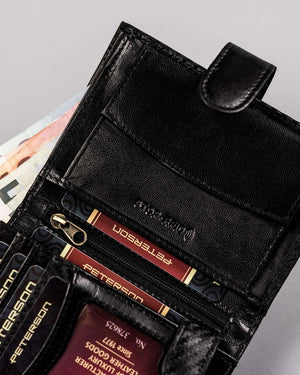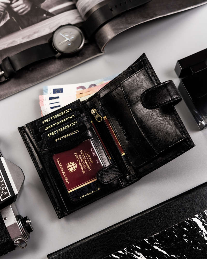 Ši didelė vyriška odinė piniginė, pagaminta Peterson, yra puikus pasirinkimas tiems, kurie vertina funkcionalumą ir stilių. Piniginės dizainas užtikrina, kad joje patogiai tilps visos kasdien reikalingos kortelės, dokumentai ir grynieji pinigai. Vidus išklotas logotipu pažymėtu pamušalu, kuris apsaugo odą nuo pažeidimų.