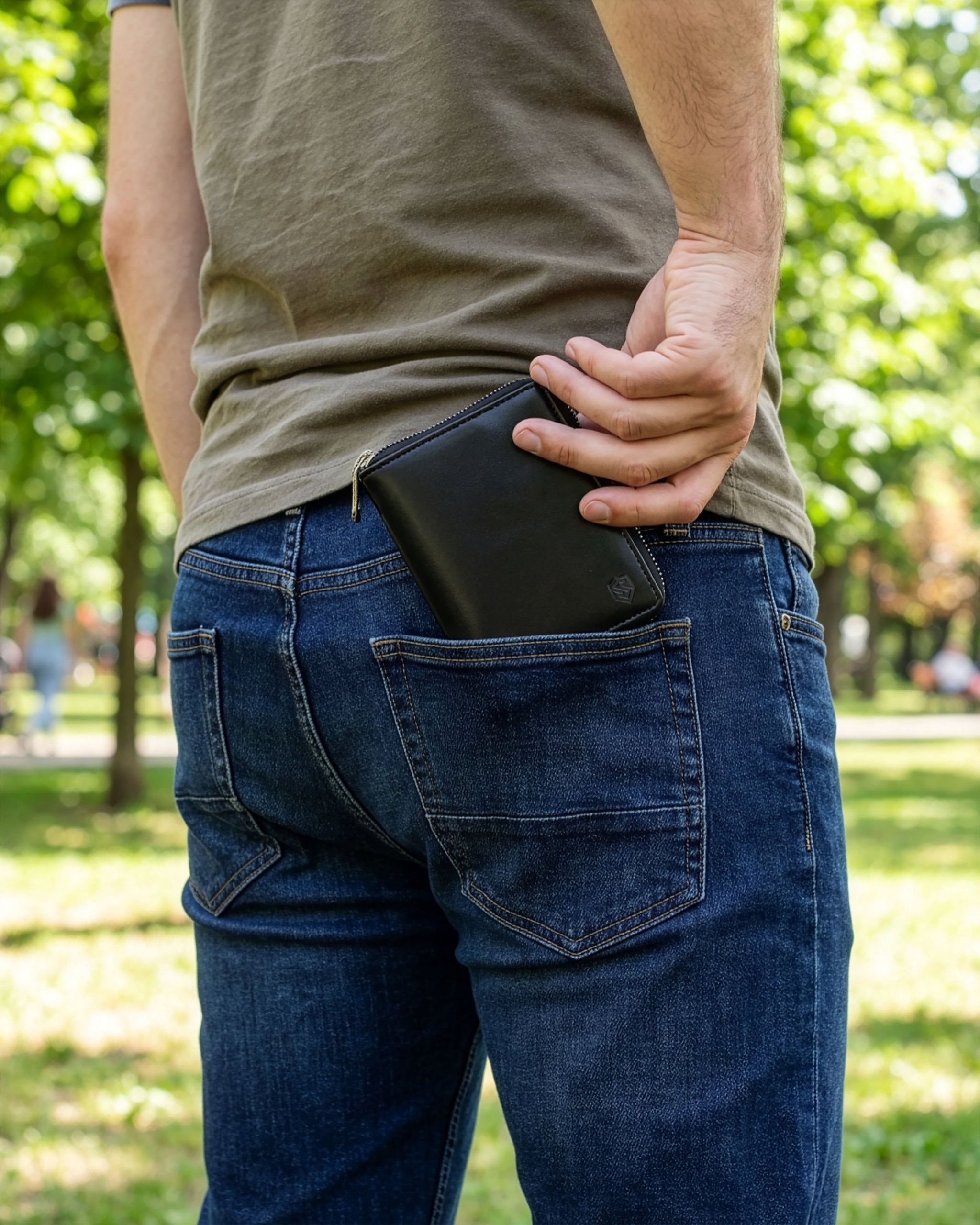 Piniginėje integruota RFID apsaugos technologija, kuri apsaugo jūsų banko korteles nuo neteisėto bekontakčio nuskaitymo.