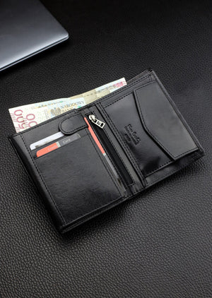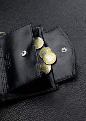 Piniginė pagaminta iš poliruotos natūralios odos – lygi, subtiliai blizgi ir patvari. Juoda spalva, tvarkingos siūlės ir metalinis logotipas kuria laikui nepavaldų įvaizdį.