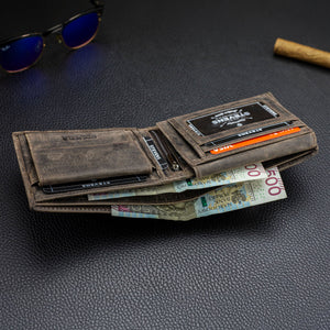 Horizontali vyriška piniginė, pagaminta iš aukštos kokybės natūralios veršiuko odos rudos (nubuko tipo) spalvos. Kompaktiška, talpi ir patogi kasdieniam naudojimui. Išmatavimai: 12,5 × 10,5 × 2,5 cm.