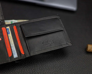 Horizontali vyriška piniginė iš švelniai poliruotos natūralios odos. Kompaktiška, talpi ir elegantiška kasdienai. Matmenys: 9,5 × 12,5 × 2 cm.
