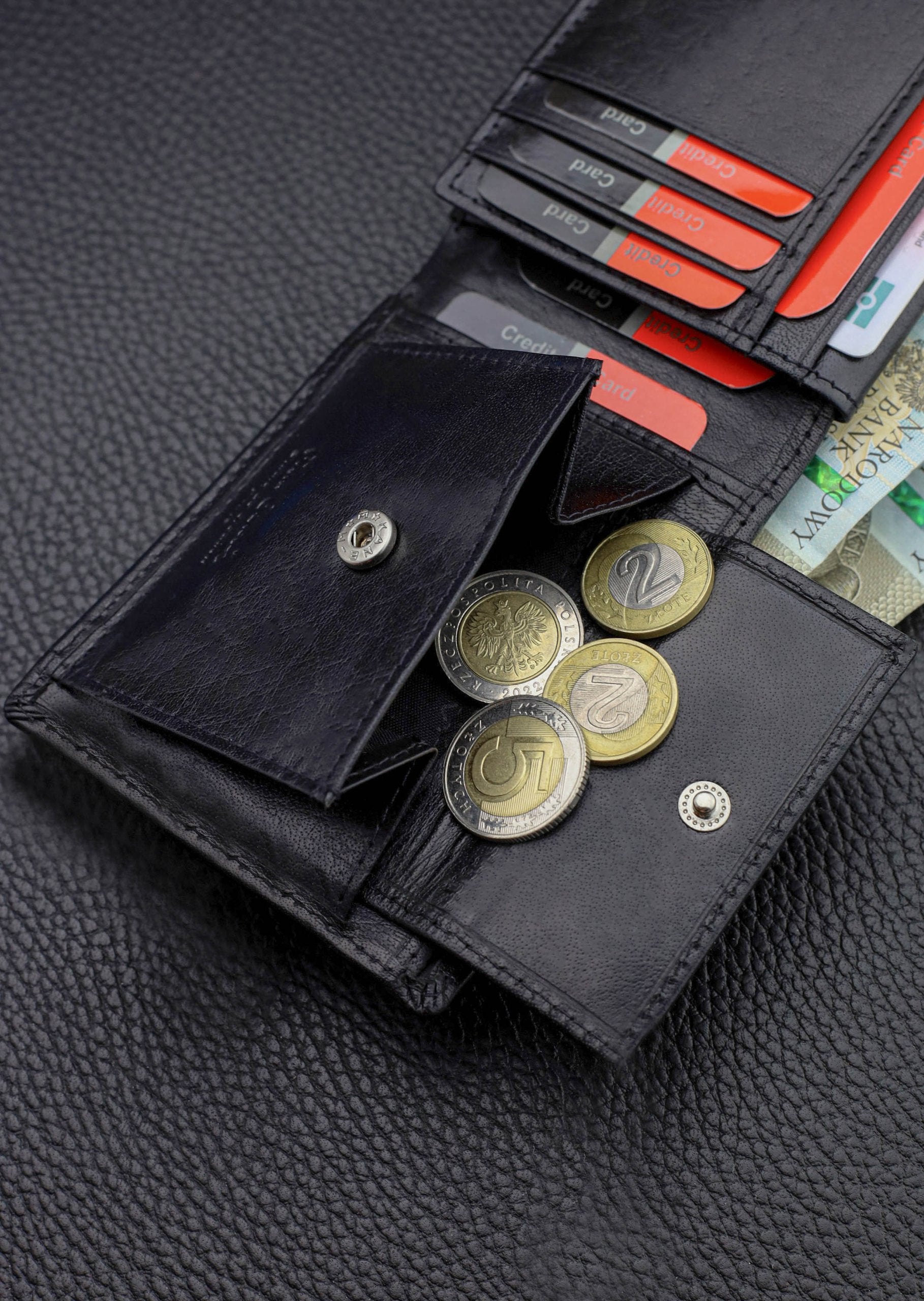 Du erdvūs skyriai patogiai talpina visus PLN ir EUR nominalus – kasdieniam naudojimui.