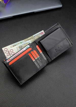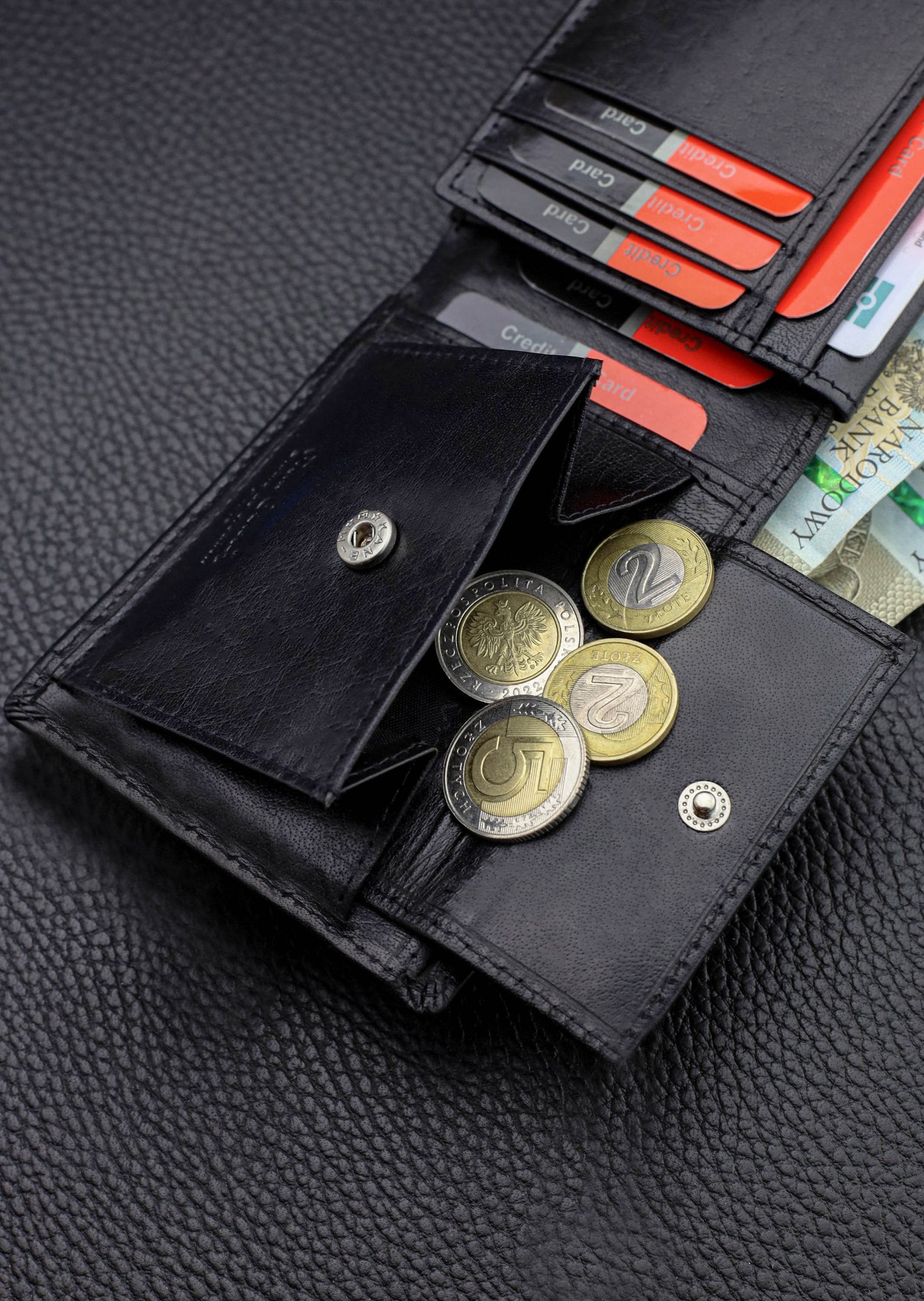 Pagaminta iš natūralios odos – lygi, subtiliai blizgi ir atspari dėvėjimuisi. Išorėje – be išorinio užsegimo (švarus siluetas), viduje monetų kišenė su spaude. Spalva – juoda.