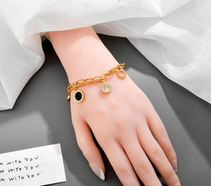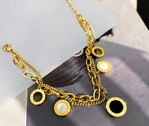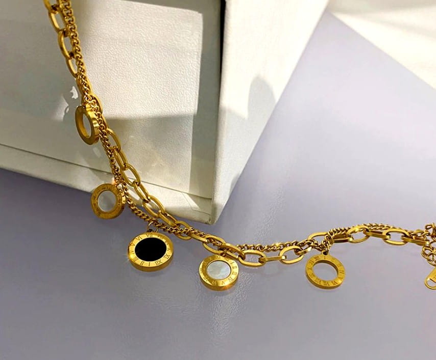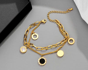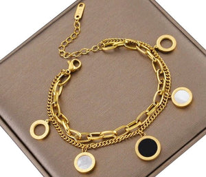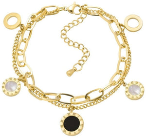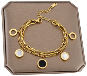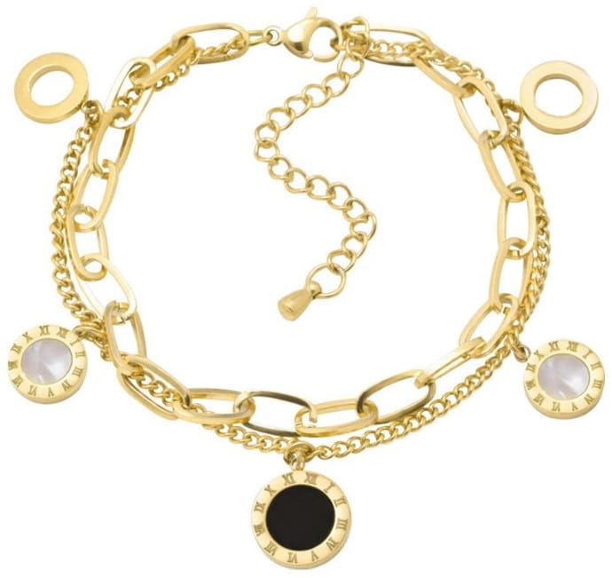 Elegantiška apyrankė iš chirurginio plieno, padengta 18 karatų auksu. Antialerginė bižuterija, puikiai tinkanti tiek elegantiškoms, tiek kasdienėms aprangoms. Madingas aksesuaras bet kokiai progai, tinka prie megztinių, suknelių ir palaidinių.