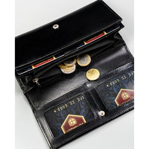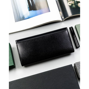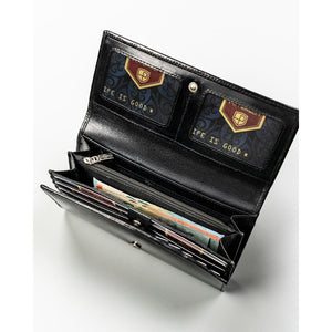 Didelė juoda moteriška odinė piniginė su atvartu ir spaude