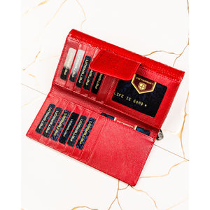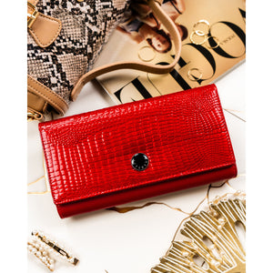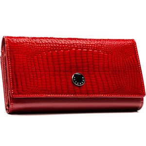 Didelė moteriška piniginė iš natūralios odos, skirta patogiam kasdieniam naudojimui. Raudona spalva ir krokodilo rašto faktūra suteikia aksesuarui išskirtinumo, o apgalvotas vidaus išdėstymas leidžia patogiai susidėti korteles, grynuosius ir dokumentus.