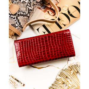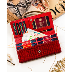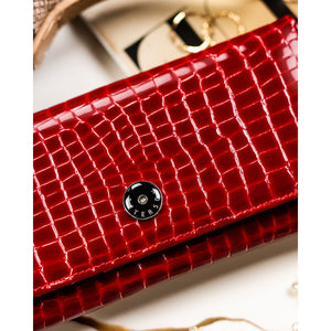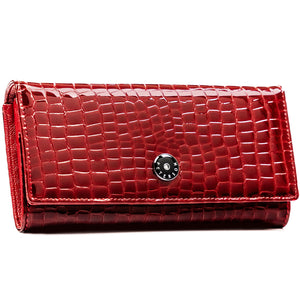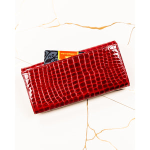 Elegantiška ir talpi moteriška piniginė iš natūralios odos, pasižyminti ryškia raudona spalva ir krokodilo odos faktūra. Tai praktiškas pasirinkimas kasdieniam naudojimui, derinantis stilių, patogumą ir kortelių apsaugą.