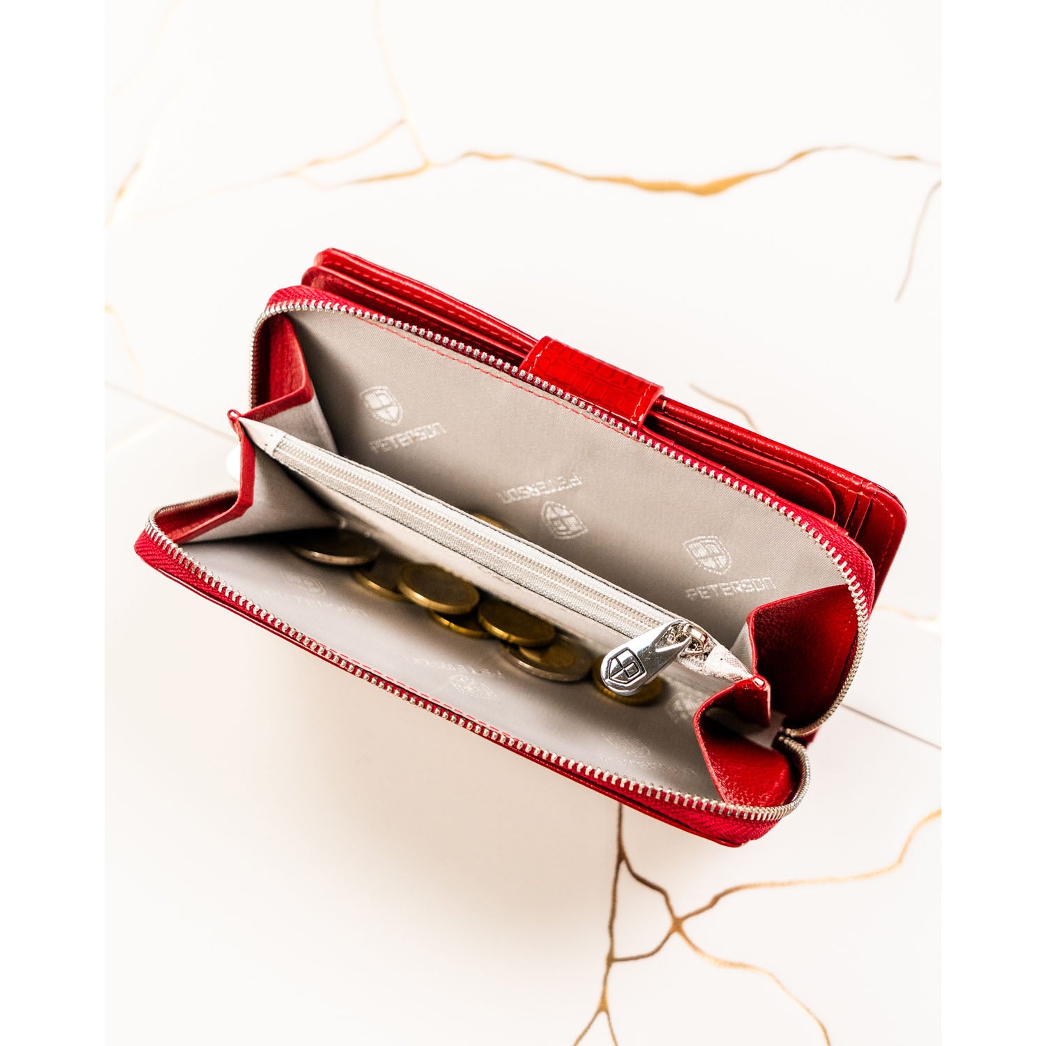 Didelė raudona moteriška piniginė Peterson – elegantiška ir talpi vertikali odinė piniginė, sukurta patogiam kasdieniam naudojimui. Dėl apgalvoto vidaus išdėstymo ji puikiai tinka moterims, kurios nešiojasi daug kortelių, grynųjų ir smulkių monetų.