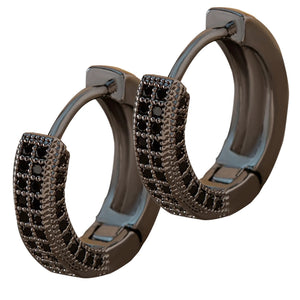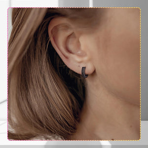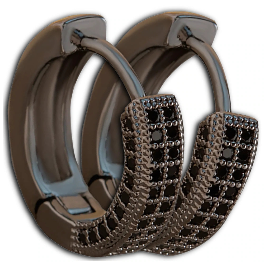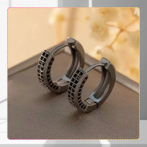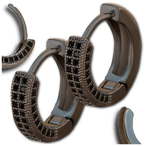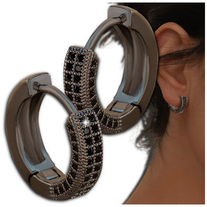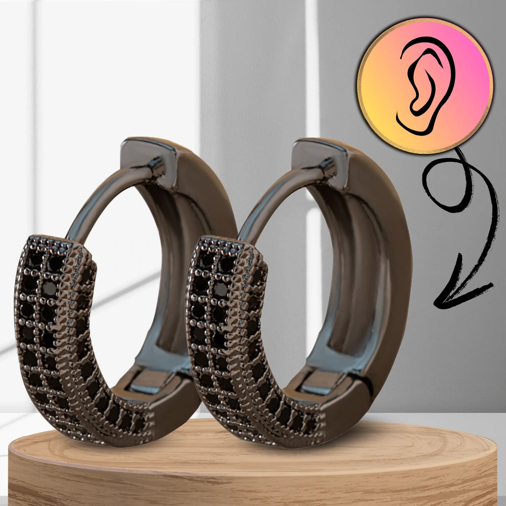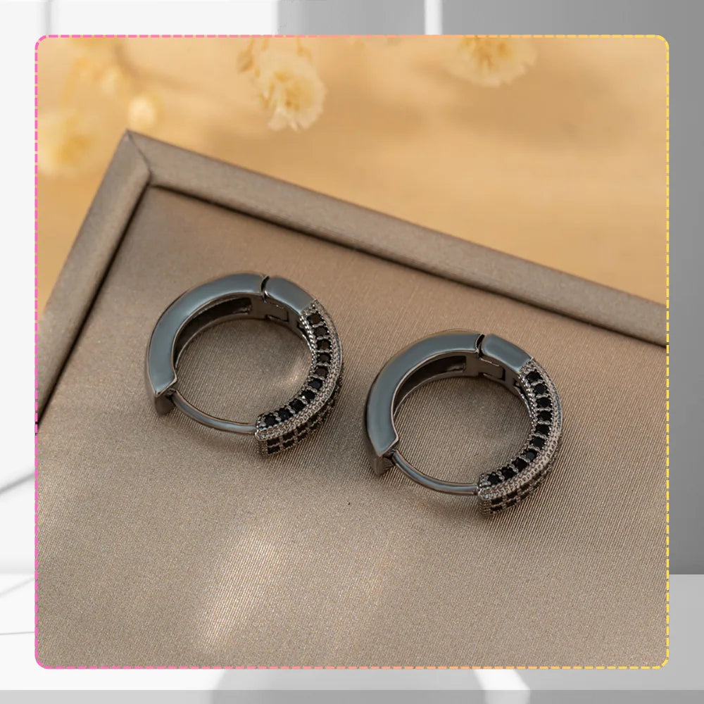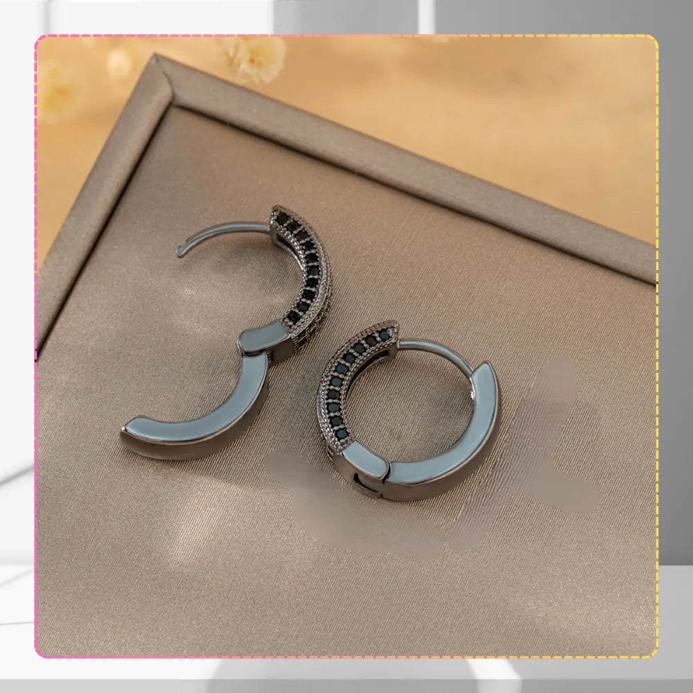 Klasikiniai juodi moteriški auskarai, papuošti cirkoniais. Puikiai tinka bet kokiai progai ir stiliui. Spalva: juoda. Medžiaga: juvelyrinis metalas, varis.