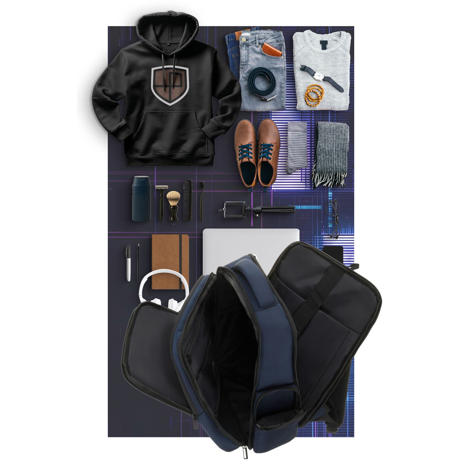 - Skyrius kompiuteriui: atskira paminkštinta kišenė nešiojamam kompiuteriui iki 14" (kišenės išmatavimai: 36 × 23 cm).