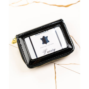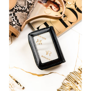 Kompaktiška moteriška piniginė iš lakinės natūralios odos. Blizgus paviršius ir auksinės spalvos detalės suteikia tvarkingą, elegantišką išvaizdą. Dėl mažo dydžio patogu nešiotis mažoje rankinėje.