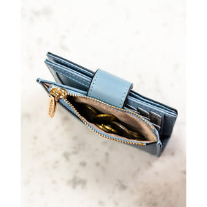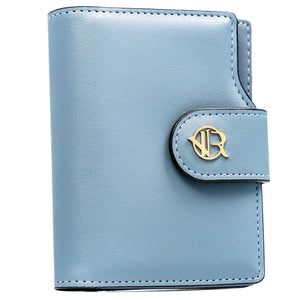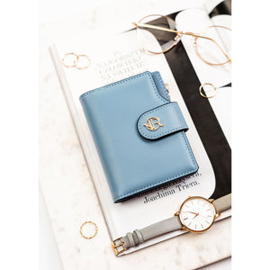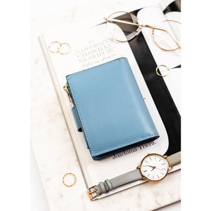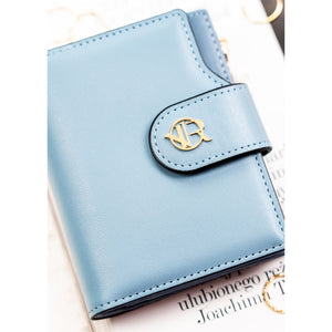 Moteriška piniginė iš ekologiškos odos, šviesiai mėlynos spalvos. Vertikalios formos, su RFID apsauga ir patogiu skyrių išdėstymu kasdieniam naudojimui.