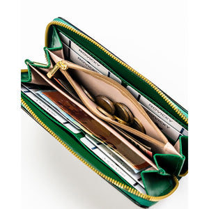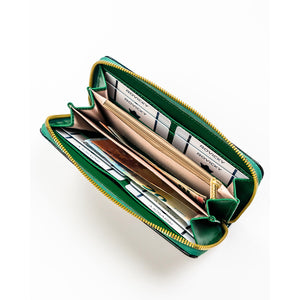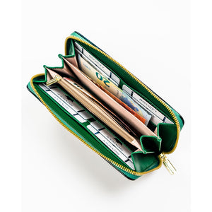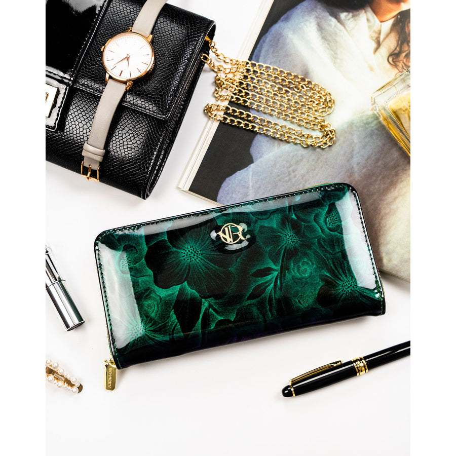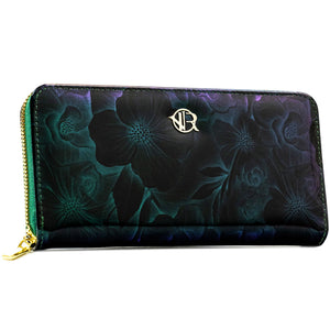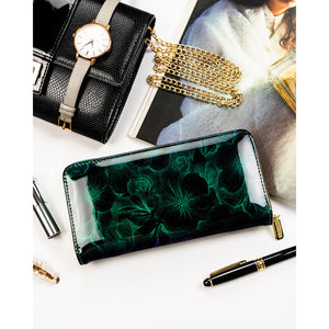 Moteriška piniginė–dėklas iš ekologiškos odos, žalios spalvos, su gėlių raštu. Patogus horizontalus formatas, užsegama užtrauktuku. Tinka kasdieniam naudojimui, kai reikia tvarkingai susidėti korteles, dokumentus ir grynuosius.