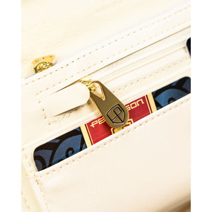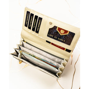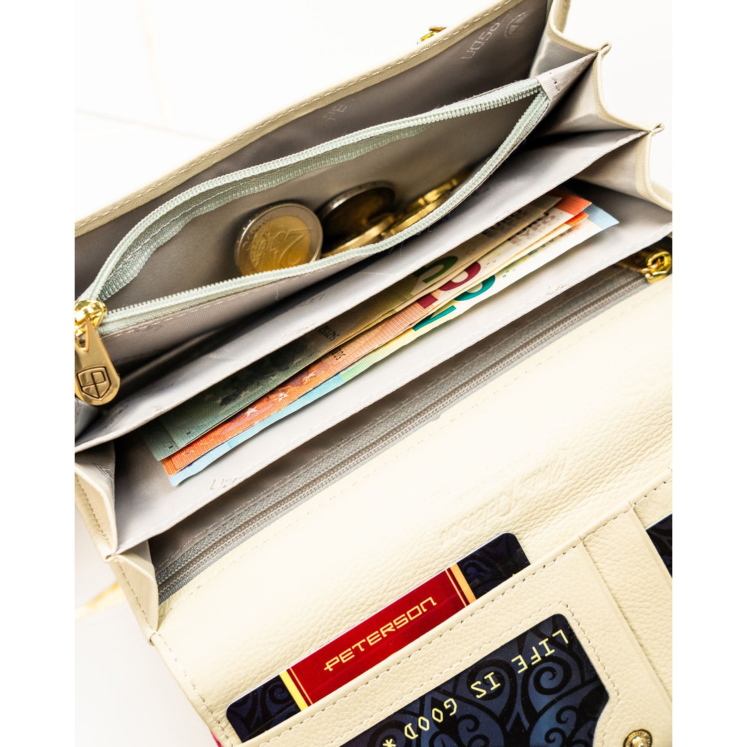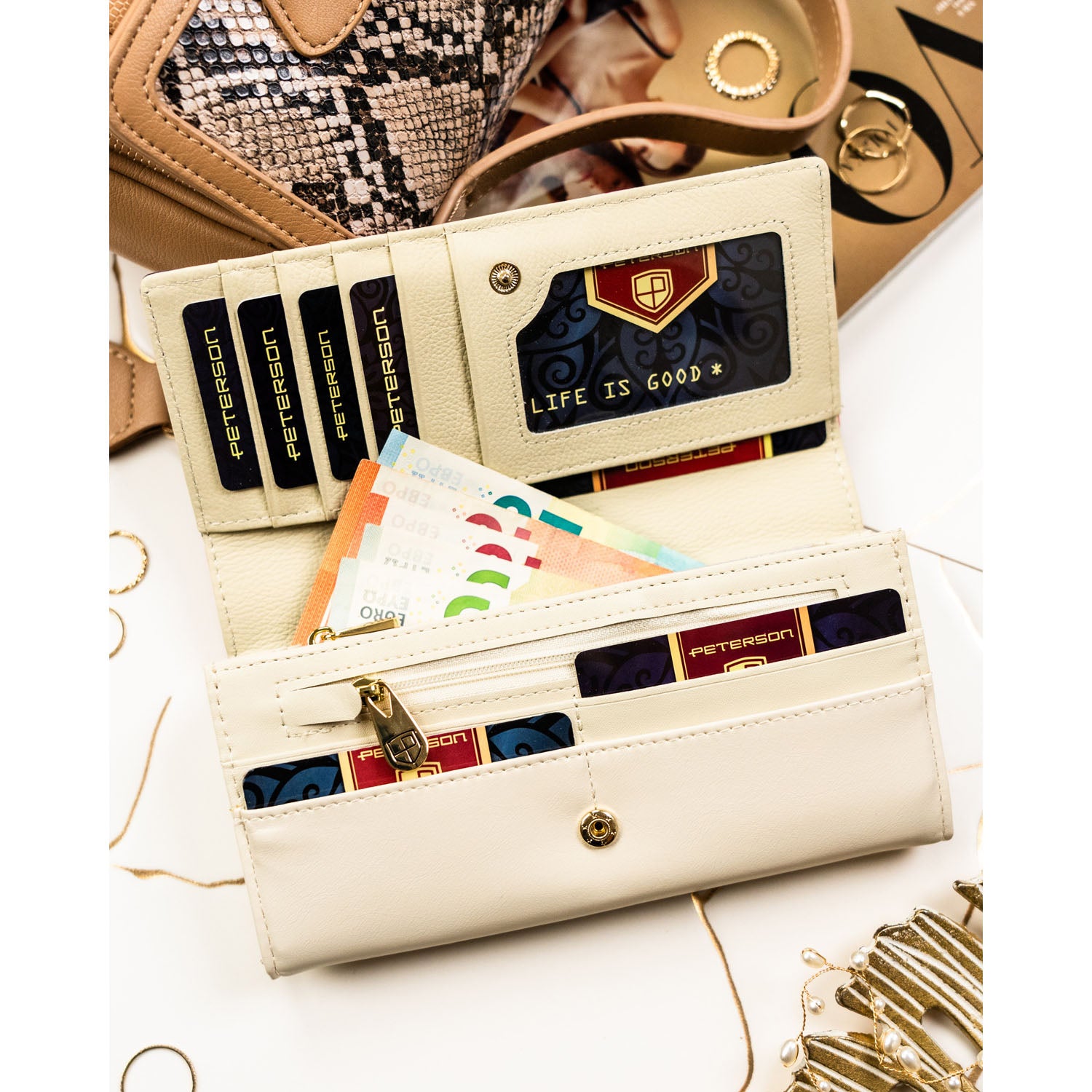 Peterson moteriška piniginė iš dirbtinės odos, smėlios spalvos, su užsegimu ir RFID apsauga.