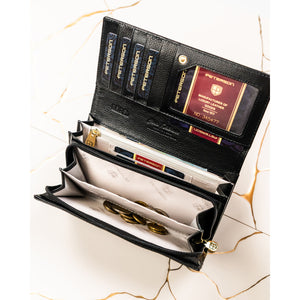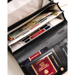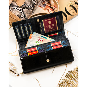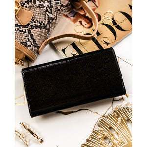 Elegantiška ir talpi moteriška piniginė iš natūralios odos, skirta patogiam kasdieniam naudojimui. Juoda spalva ir auksinės spalvos detalės suteikia klasikinei piniginei išskirtinį, moterišką charakterį.