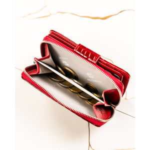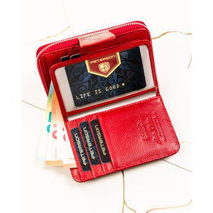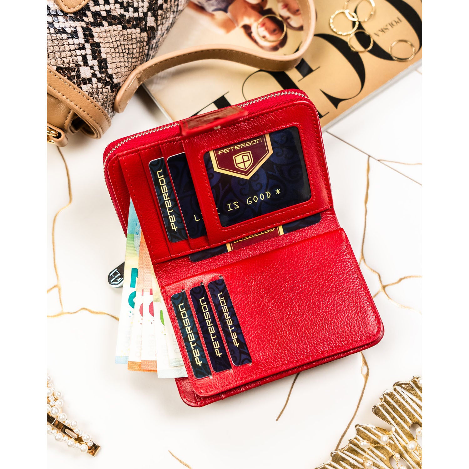 Ši raudona Peterson moteriška piniginė tinka kasdieniam nešiojimui rankinėje, derina kompaktišką dydį su pakankamu vietos kiekiu kortelėms ir gryniesiems.