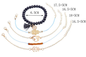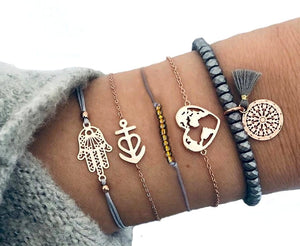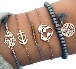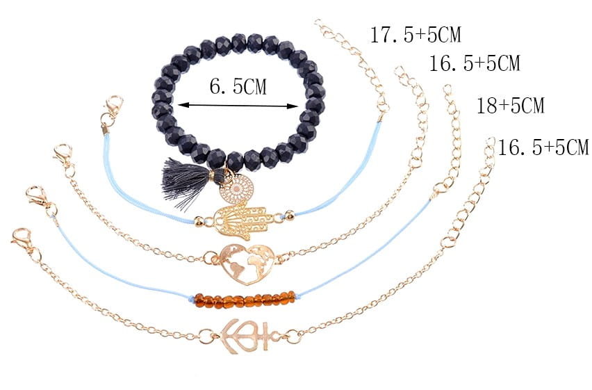Praturtinkite savo papuošalų kolekciją su šiuo unikaliu penkių apyrankių rinkiniu. Kiekviena apyrankė yra pagaminta iš juvelyrinio metalo, karoliukų ir virvelės, suteikiant joms išskirtinį stilių ir eleganciją.