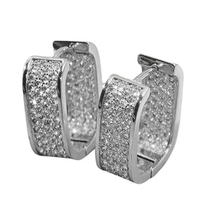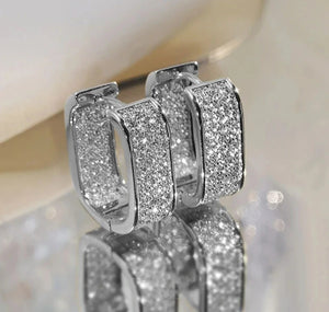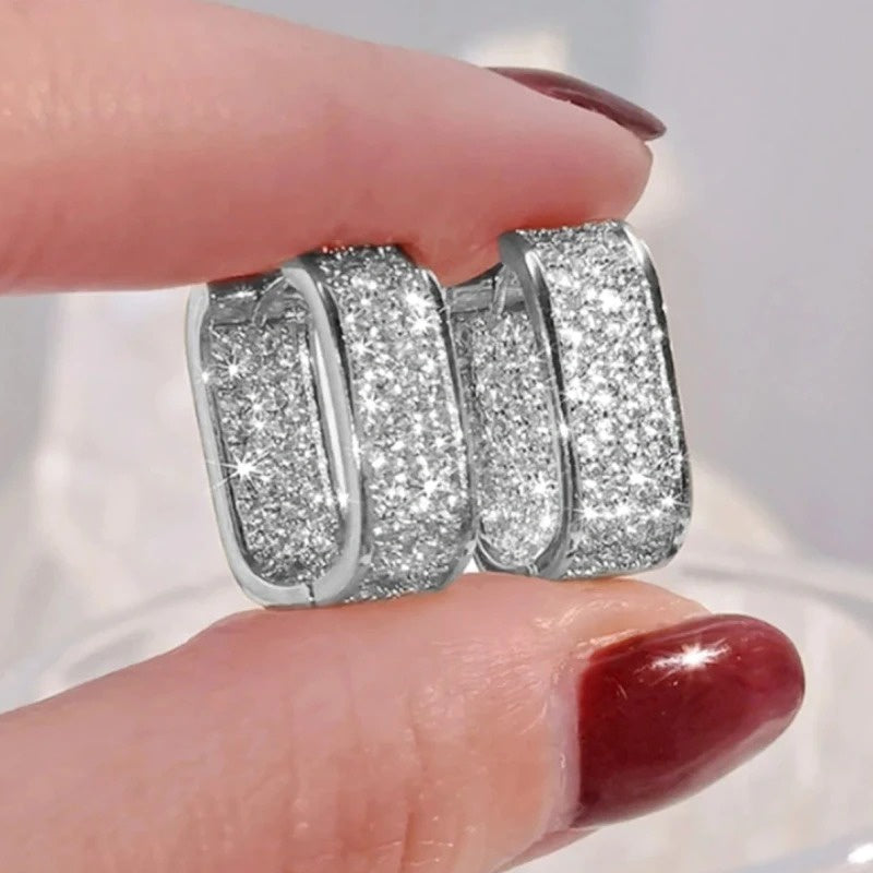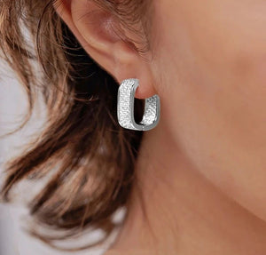 Šie elegantiški sidabro spalvos auskarai pasižymi geometriniu dizainu ir yra dekoruoti cirkoniais, suteikiančiais jiems ypatingo žavesio.