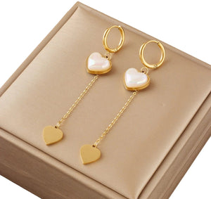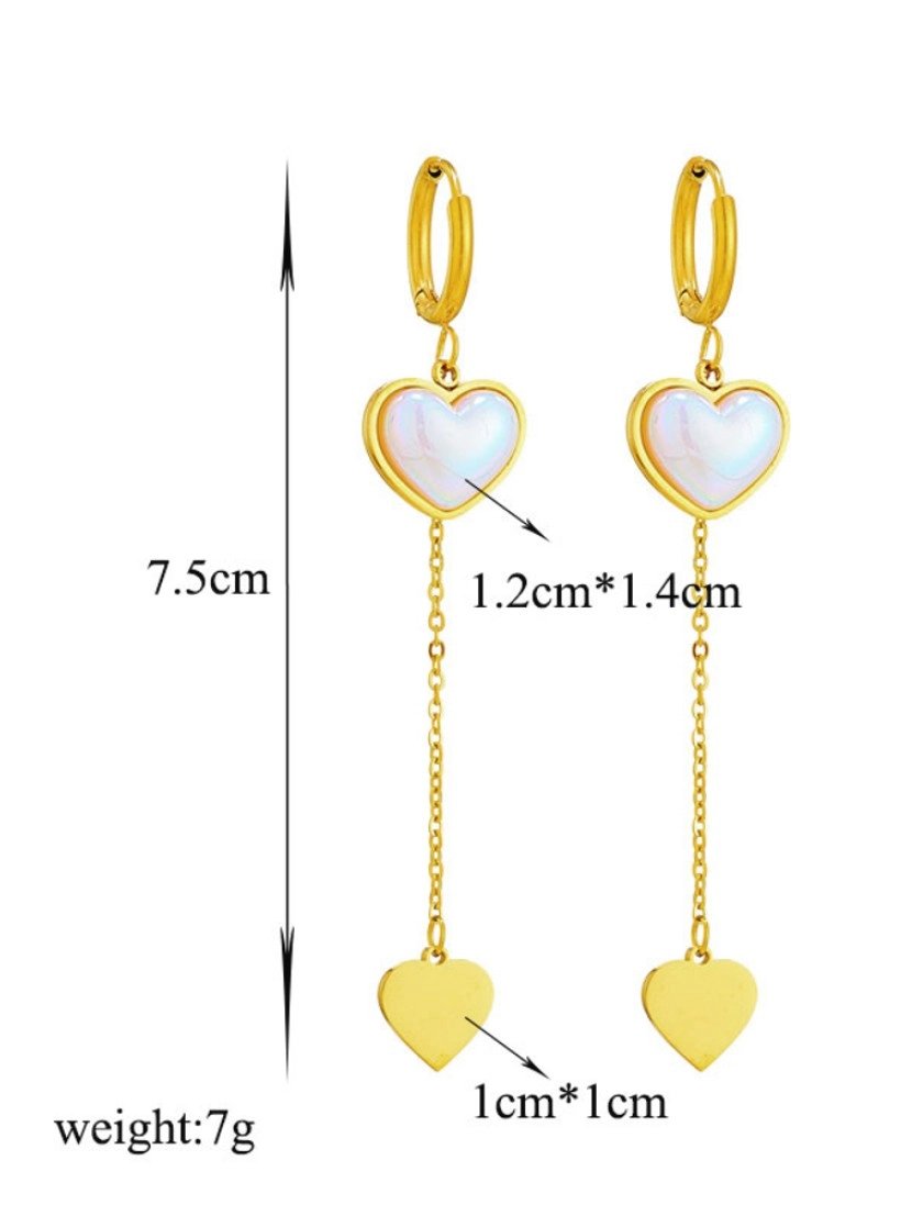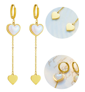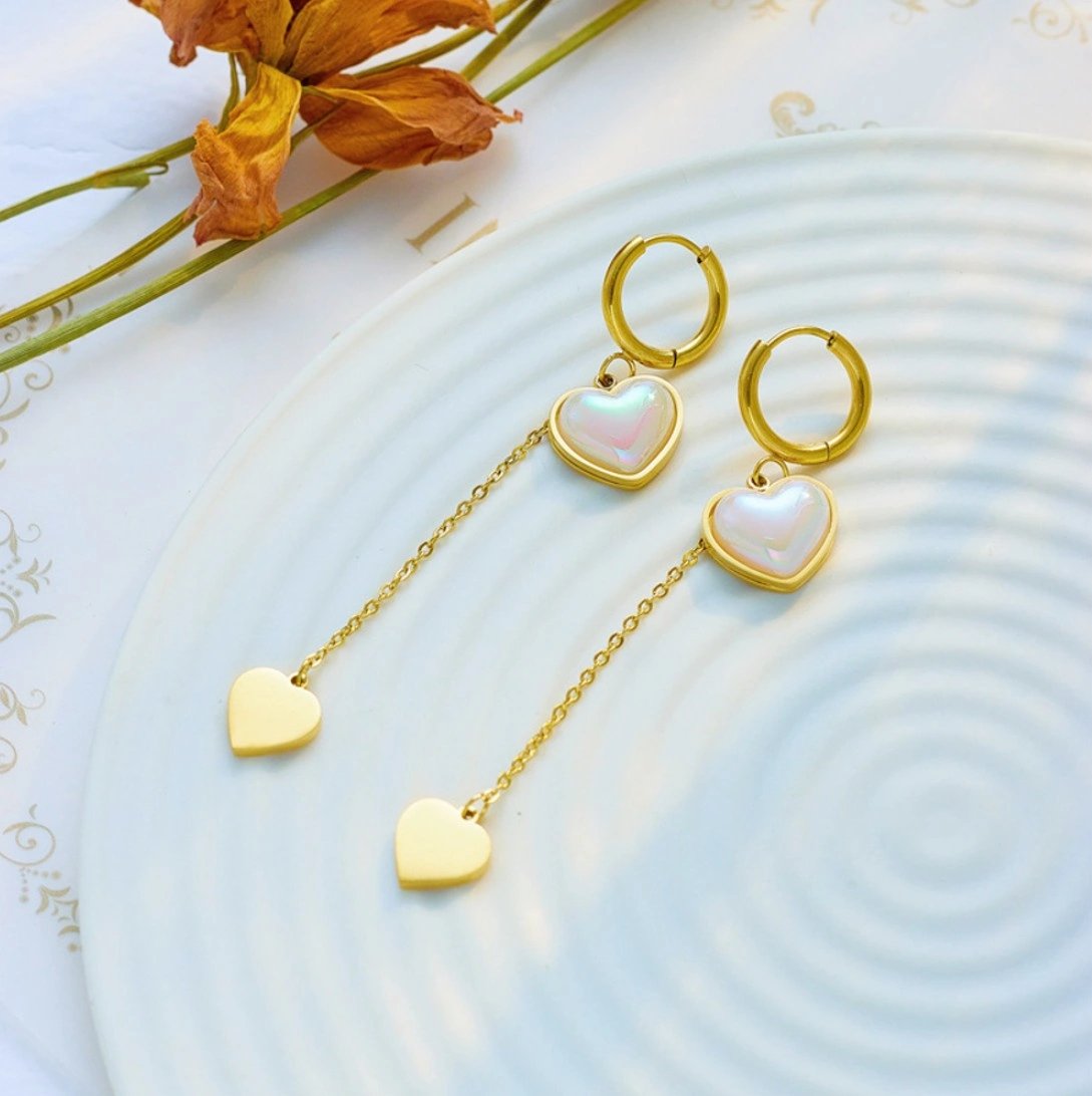 - Dizainas: Kabantys, ilgi auskarai su širdelės formos detalėmis.