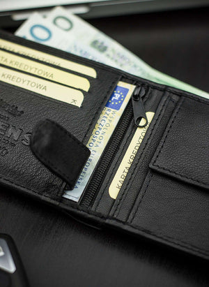 - 1 užtrauktuku užsegamas skyrius centrinėje piniginės dalyje smulkiems dokumentams.