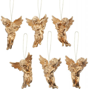 Šis pakabinamų dekoracijų rinkinys suteiks jūsų eglutei ypatingo žavesio. Rinkinį sudaro šeši aukso spalvos angelai, kurie puikiai papildys jūsų šventinį interjerą.