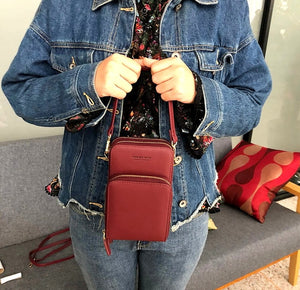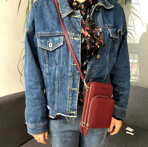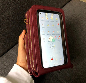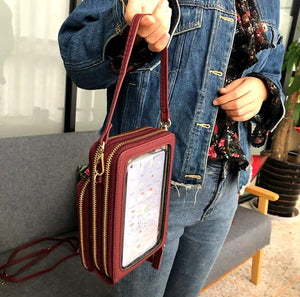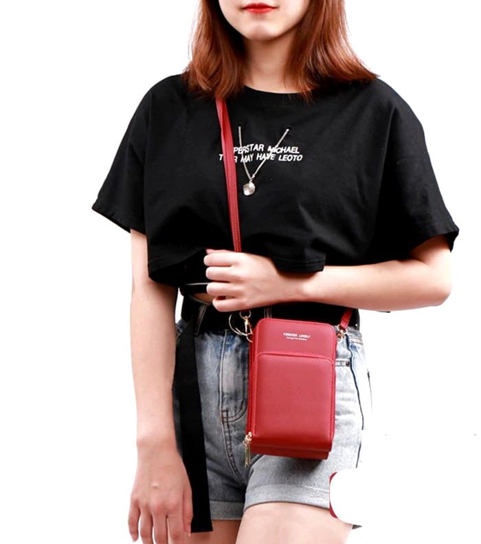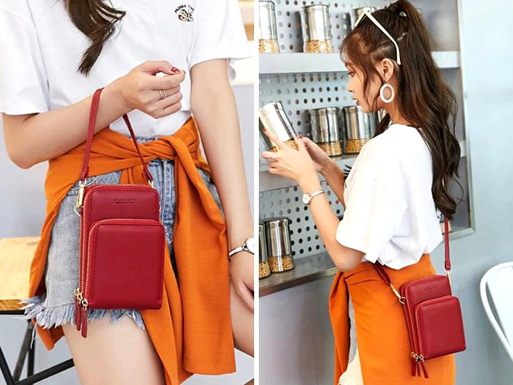 - Pirmasis skyrius: Užsegamas užtrauktuku, viduje yra papildomas skyrius. Išorėje yra folijos langelis, leidžiantis valdyti telefoną neišimant jo iš rankinės.