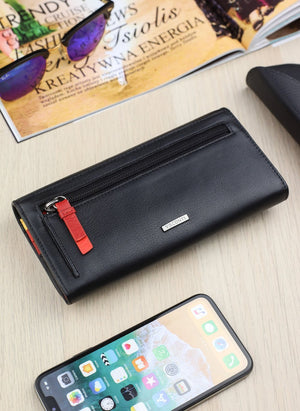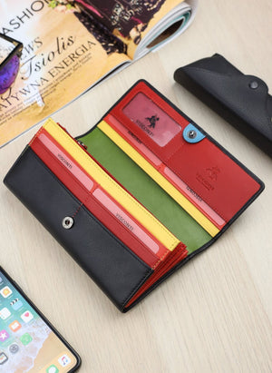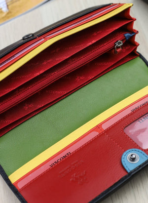 Ši elegantiška moteriška piniginė iš Visconti CHLOE kolekcijos yra puikus britų dizaino pavyzdys. Juodos spalvos išorė su vaivorykštinėmis siūlėmis atskleidžia stilingą ir madingą interjerą, kuris puikiai atitinka šiuolaikines mados tendencijas. Piniginė užsegama patogiu užtrauktuku, o horizontalus dizainas suteikia jai modernumo.