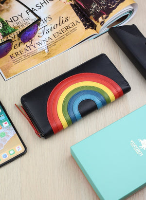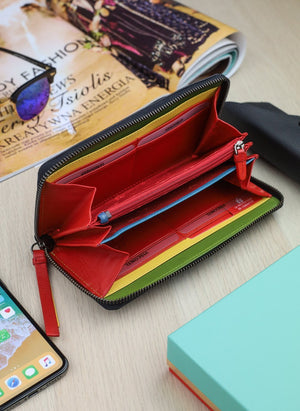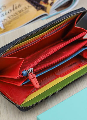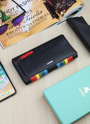 Ši elegantiška moteriška piniginė iš Visconti CHLOE kolekcijos yra puikus britų dizaino pavyzdys. Juodos spalvos išorė su vaivorykštinėmis siūlėmis atskleidžia stilingą ir madingą interjerą, kuris puikiai atitinka šiuolaikines mados tendencijas. Piniginė užsegama patogiu užtrauktuku, o horizontalus dizainas suteikia jai modernumo.