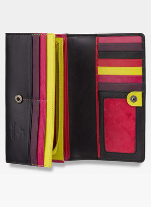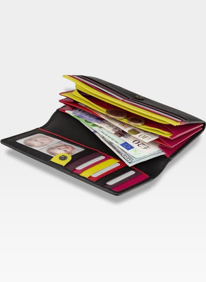 Pristatome išskirtinę moterišką piniginę iš britų prekės ženklo Visconti, priklausančią STANTORINI kolekcijai. Ši elegantiška piniginė pagaminta iš juodos natūralios odos, dekoruota vaivorykštinėmis siūlėmis, kurios suteikia unikalumo ir puikiai dera prie bet kokios rankinės.