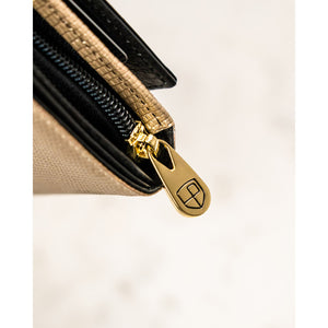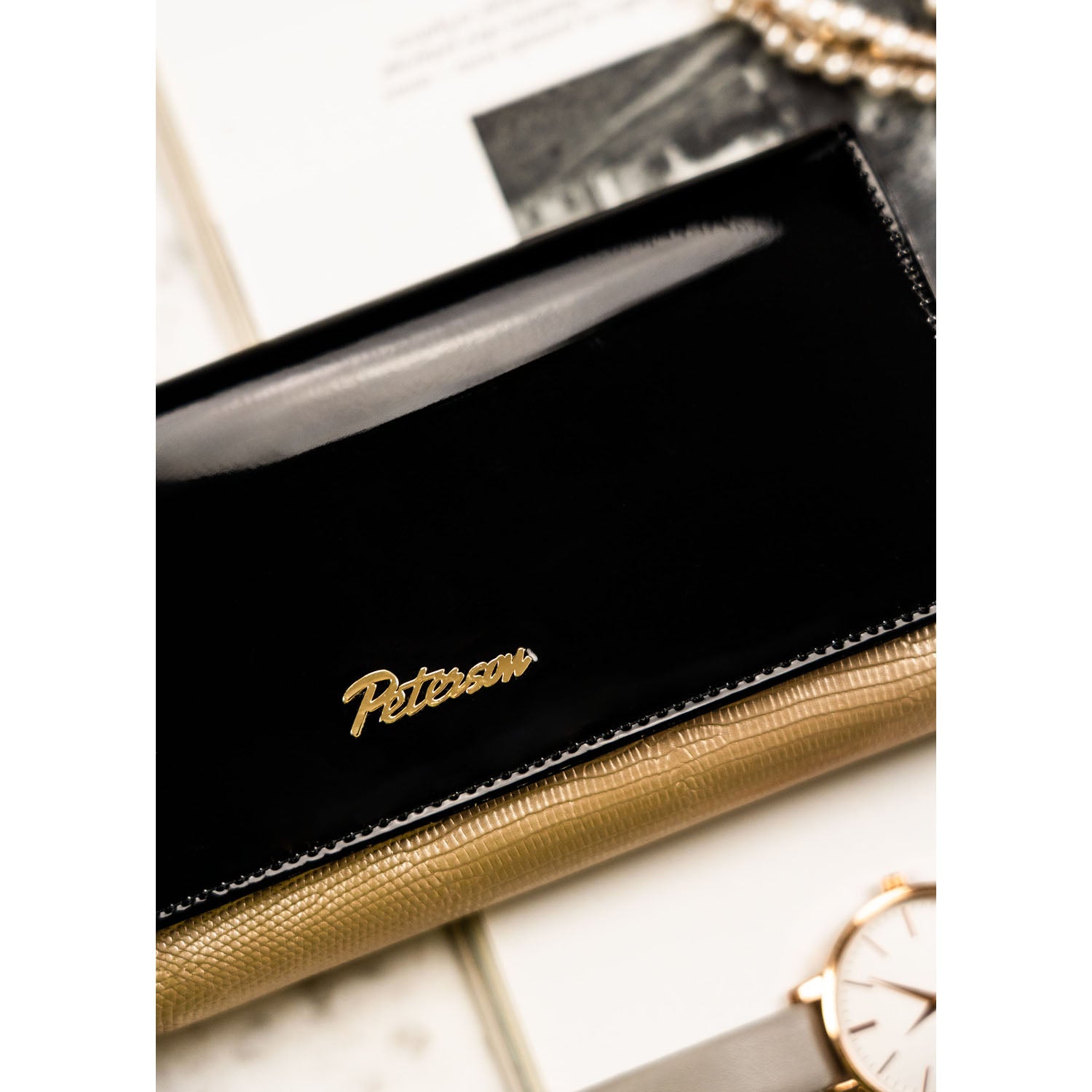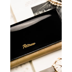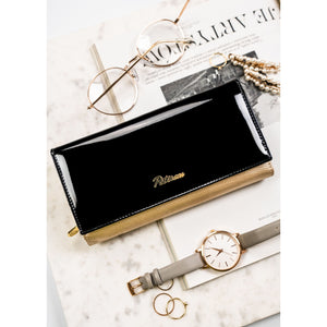 Moteriška piniginė, juoda-aukso, natūrali oda, RFID sistema