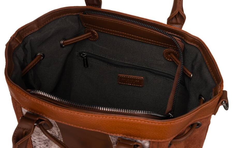 - Rankinė turi vieną erdvų skyrių, kuriame rasite dvi papildomas kišenes, skirtas smulkiems daiktams laikyti.