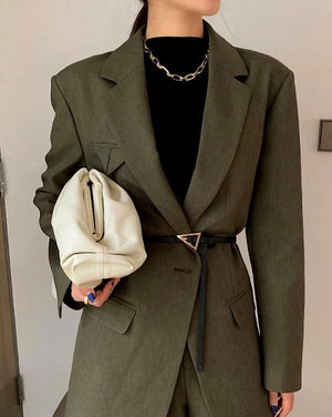 - Sagtis: auksinė trikampė metalinė sagtis, suteikianti prabangos pojūtį.
